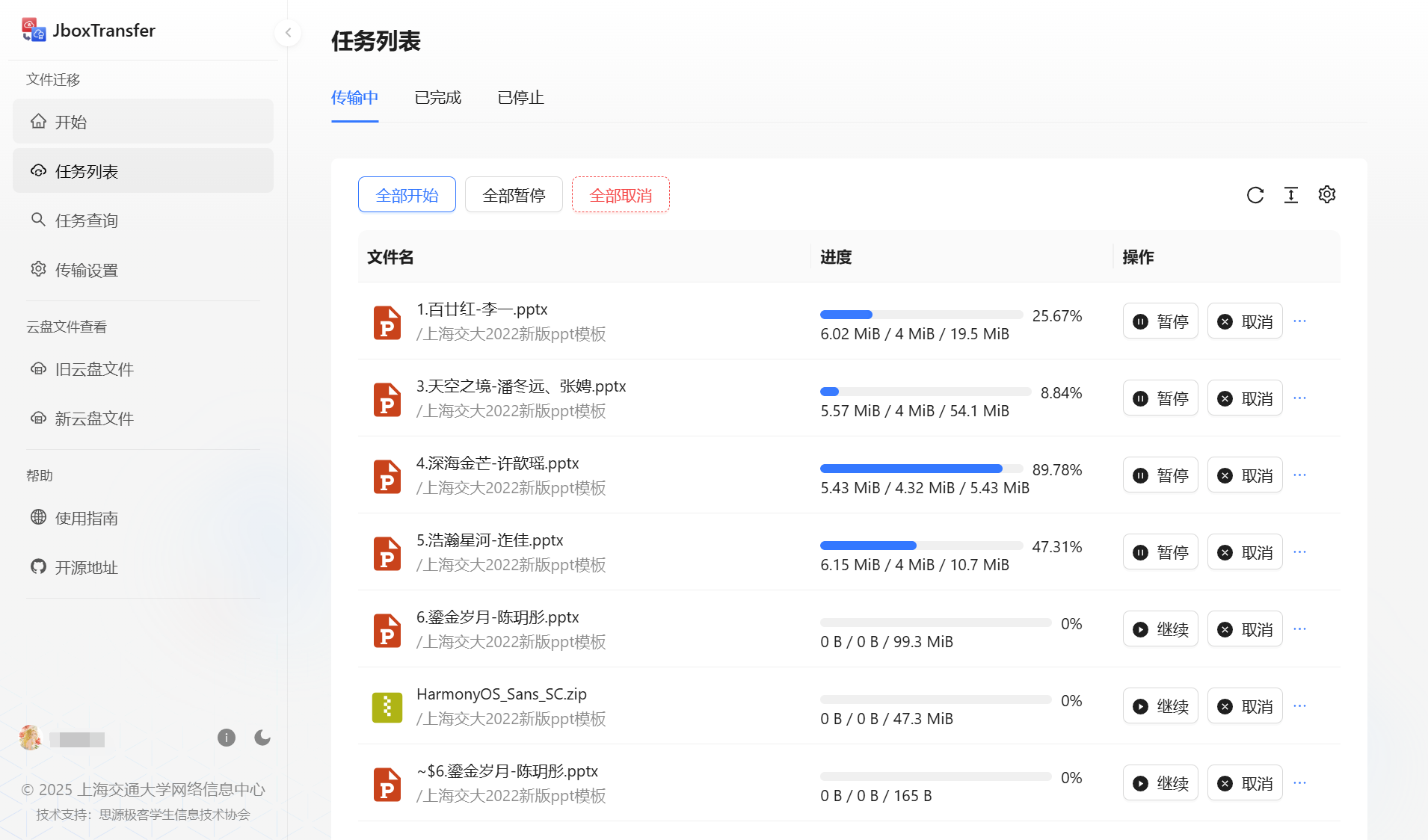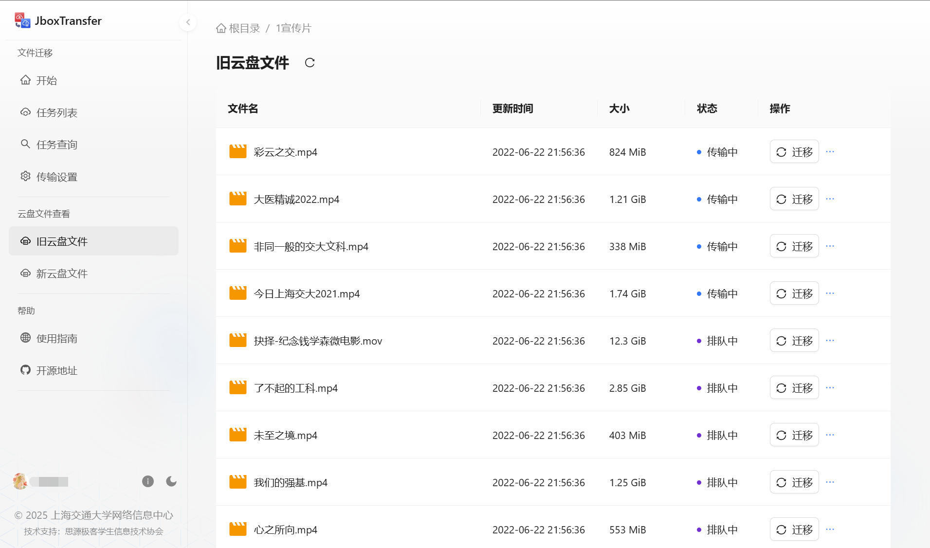 故 JboxTransfer 项目就此成立,我们的目标是推出一款高效、安全、便捷的应用程序,自动化地帮助用户更好地从 jbox 向 新云盘 迁移文件。用户在进行 jAccount 授权后可以一键迁移文件,无需占用本地磁盘空间,无需手动下载上传文件。