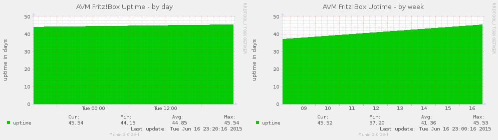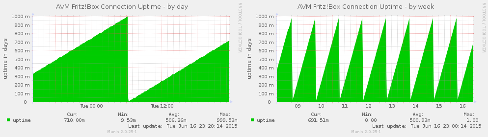 fritzbox_uptime shows you the uptime in days (requires password) (language dependant, see below).