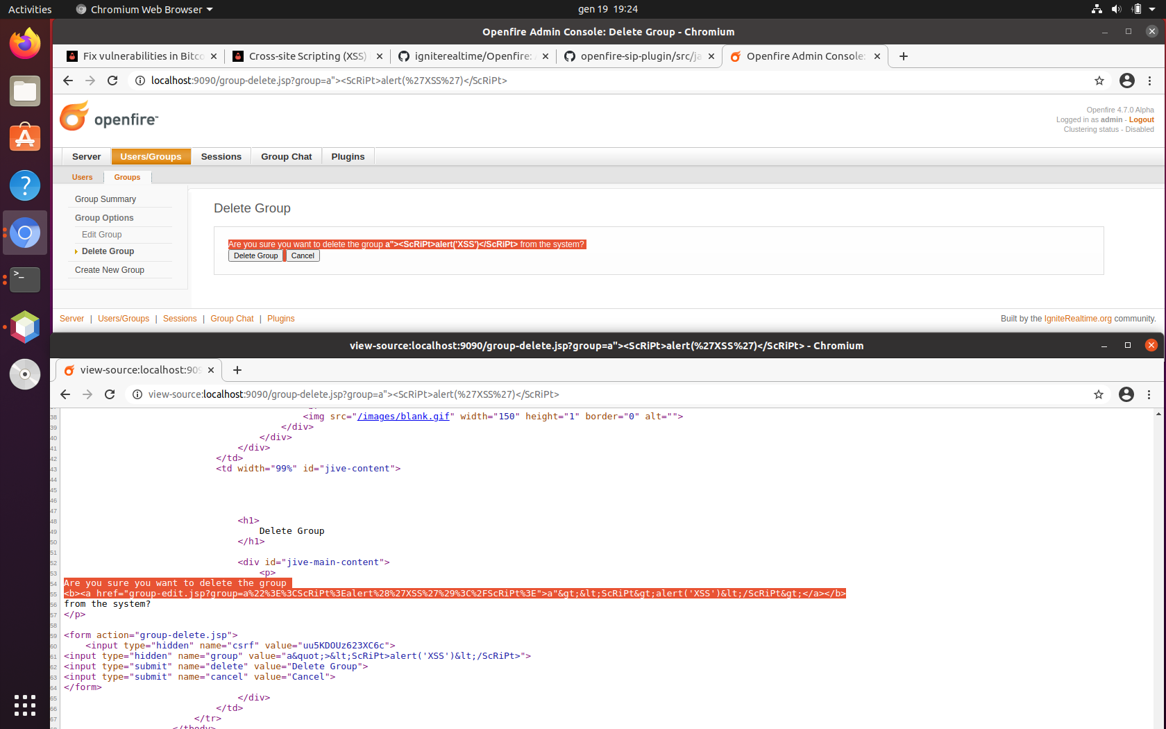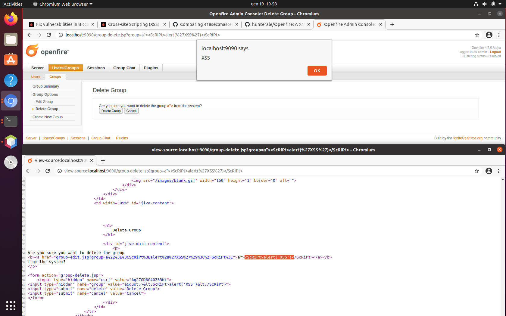 The screenshot shows the payload of XSS is now HTML-escaped so the correct view of group name is preserved but the payload can create anymore a script context to trigger the XSS