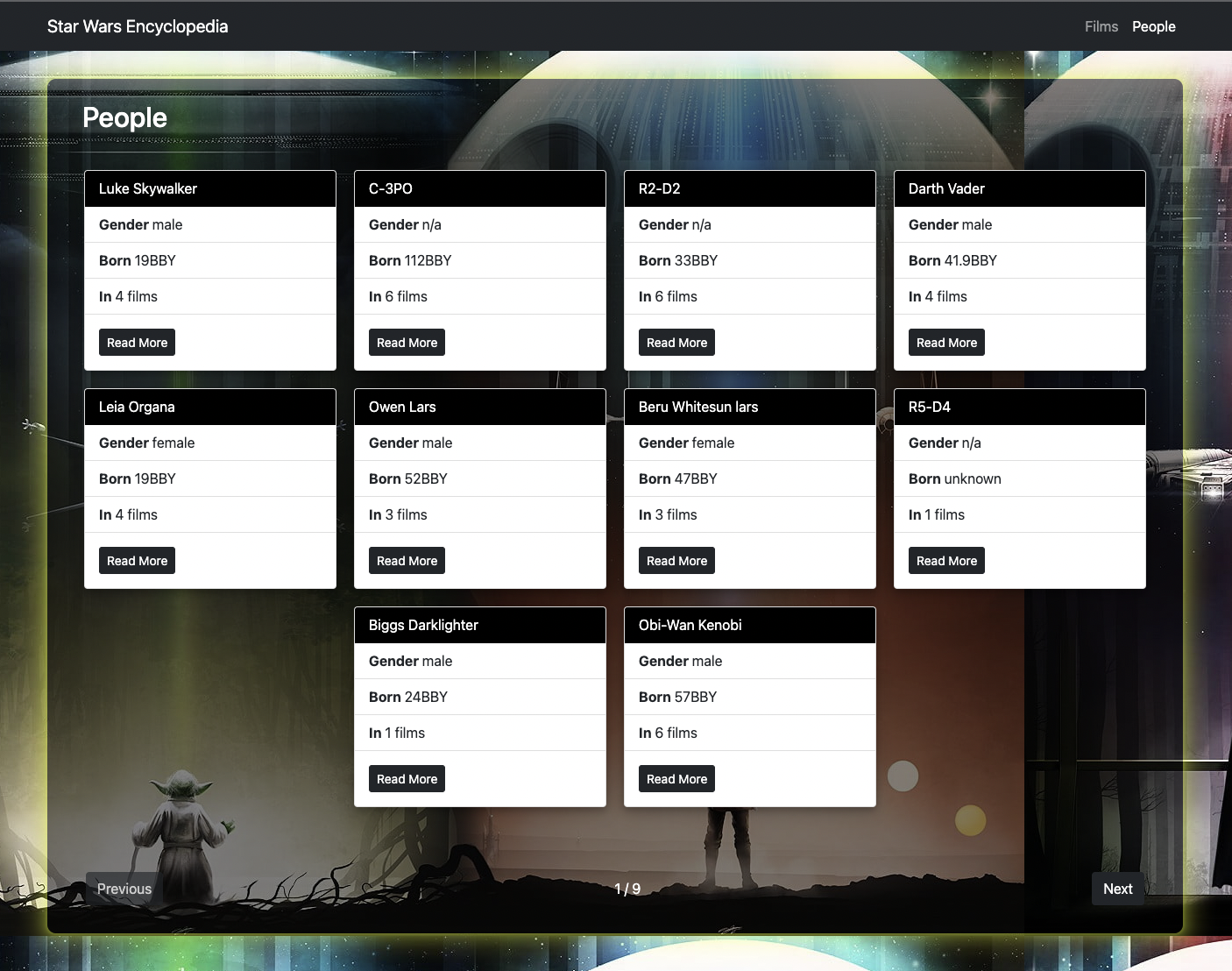 Ability to browse through movies and characters (including basic pagination) All resource objects should have links to their respective related resources (e.g., on a character's page, users should be able to click on the movies they have appeared in and be taken to the detailed page of that movie, and vice versa).