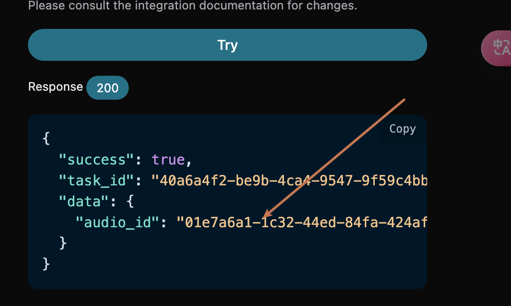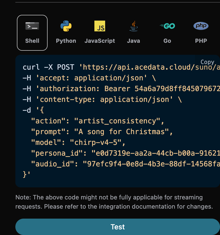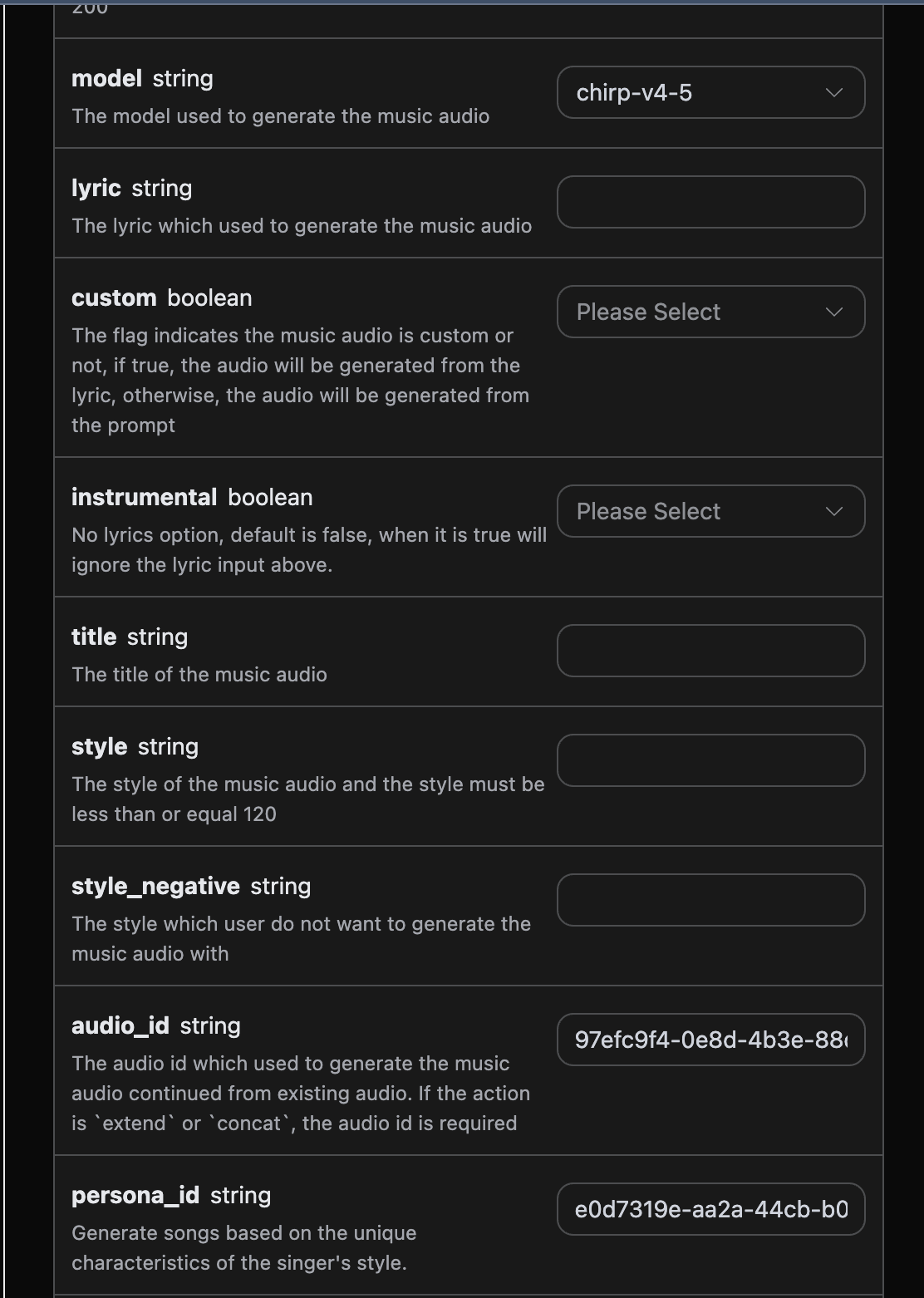 }Using the above audio_id and persona_id as 97efc9f4-0e8d-4b3e-88df-14568fa1b11f and e0d7319e-aa2a-44cb-b00a-916218d7cb0b for this example data. Then you can set the parameter action to artist_consistency, and input the ID of the song you want to continue generating and the singer style ID, as shown in the example below: