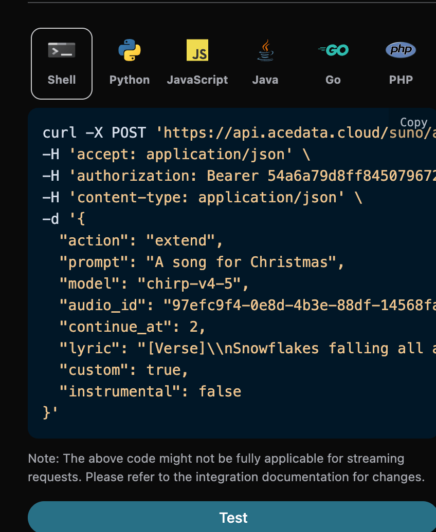However, Suno does not officially provide an API. AceDataCloud offers a set of Suno APIs that simulate the official Suno interface, making it easy and quick to generate the desired music.