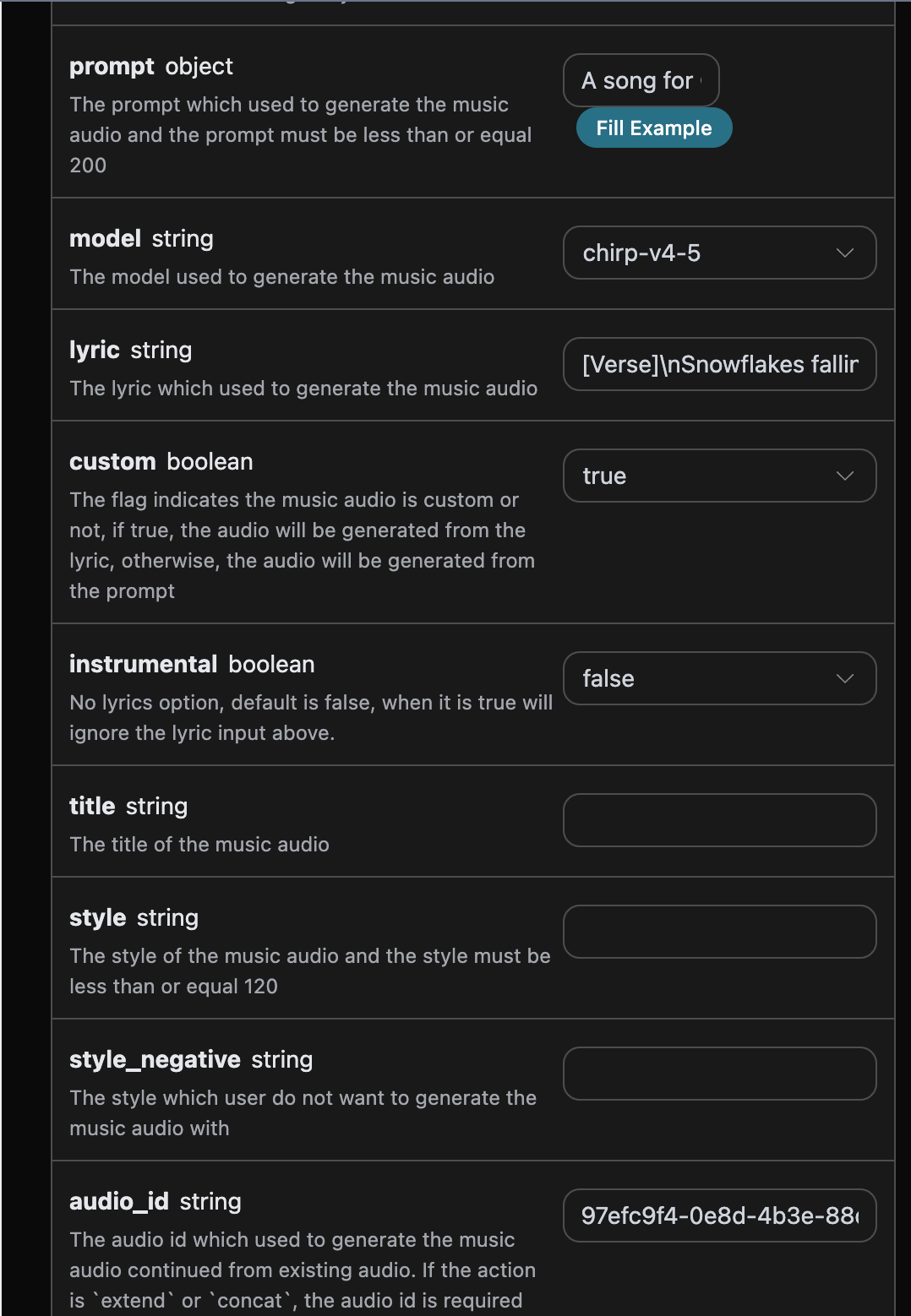 action: the action of this music generation task, default isgenerate, mainly includes:extend,upload_extend,cover,upload_cover,replace_section,concat,stems,all_stems,remaster.prompt: the prompt for the inspiration mode from Suno.model: the model for this music generation task, default ischirp-v3-5, mainly includes:chirp-v3,chirp-v4,chirp-v3-5,chirp-v4-5,chirp-v4-5-plus,chirp-v5.lyric: the lyrics content for the custom mode from Suno.custom: whether to use the custom mode, default is:false.instrumental: the pure music option for the inspiration mode from Suno.title: the music title for the custom mode from Suno.style: the music style for the custom mode from Suno.style_negative: the excluded style for the custom mode from Suno.audio_weight: the proportion of the uploaded reference audio, range 0-1, the larger the more it relies on the reference audio.audio_id: the ID of the reference music.overpainting_start/overpainting_end: the start and end time in seconds for adding vocals to existing pure music.underpainting_start/underpainting_end: the start and end time in seconds for adding accompaniment to a cappella.persona_id: the artist's song ID.continue_at: the time in seconds to continue the existing audio. For example, 213.5 means continue to 3 minutes and 33.5 seconds.style_influence: advanced parameter forstyle_influence.replace_section_end: the final time for the replacement segment.replace_section_start: the starting time for the replacement segment.vocal_gender: controls the gender of the voice, femalef, malem, effective for models 4.5 and above.weirdness: advanced parameter forweirdness.lyric_prompt: the prompt for generating lyrics, effective only whencustomistrueandlyricis not provided.callback_url: the URL for callback results.