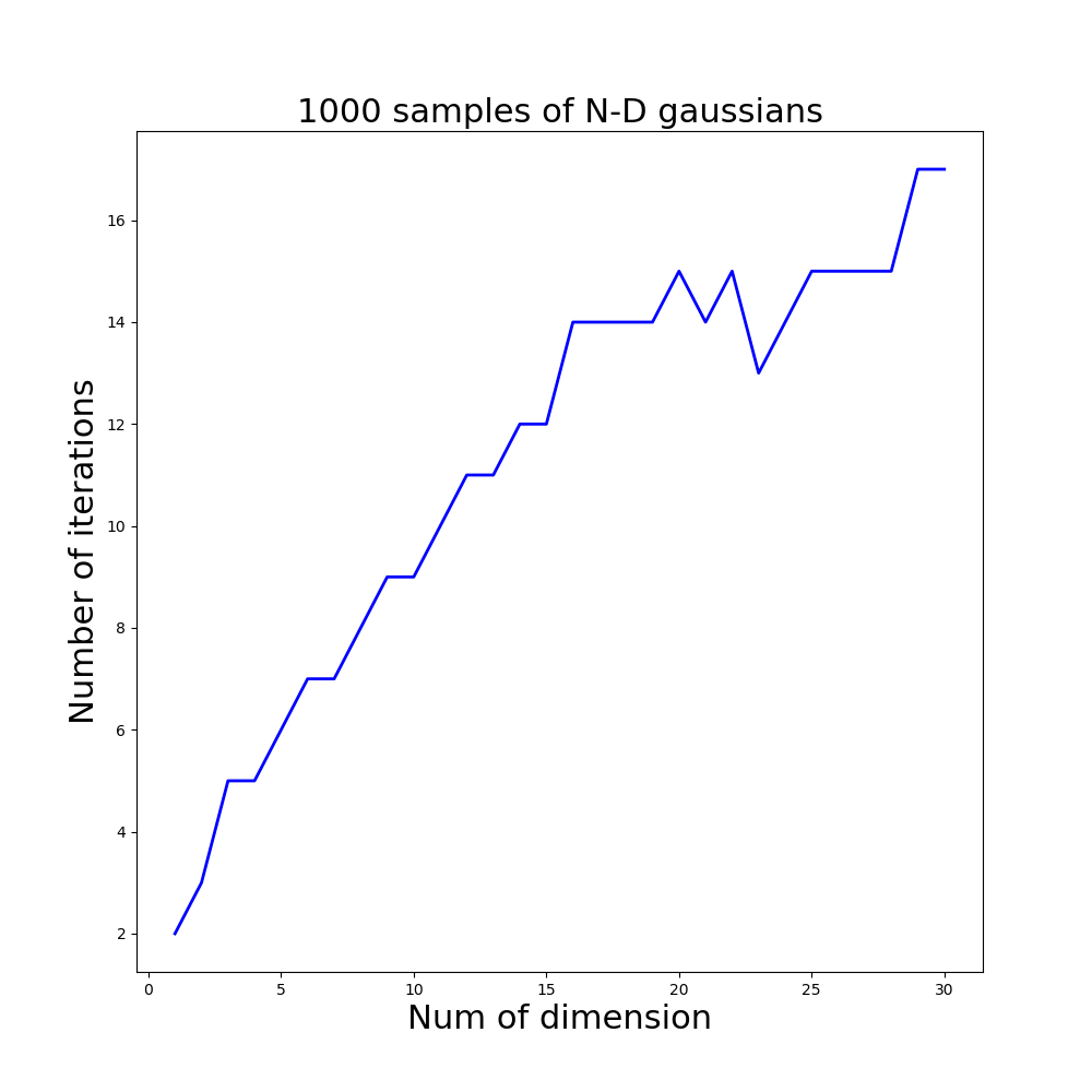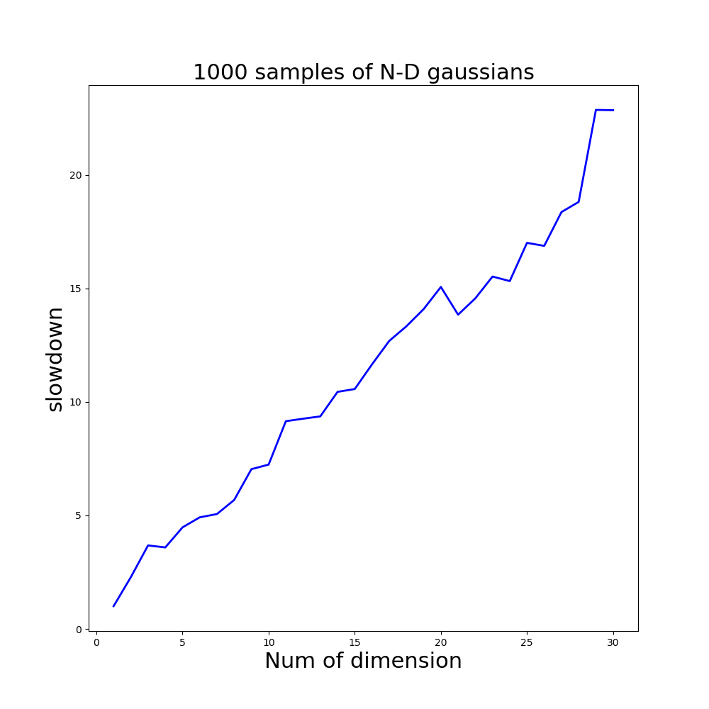 Testing slowdown and iteration number for various dimensions. Target is a mixture of 2 Gaussians in N dimensions, with means located at [-5, -5 , ...] and [5, 5, ...]