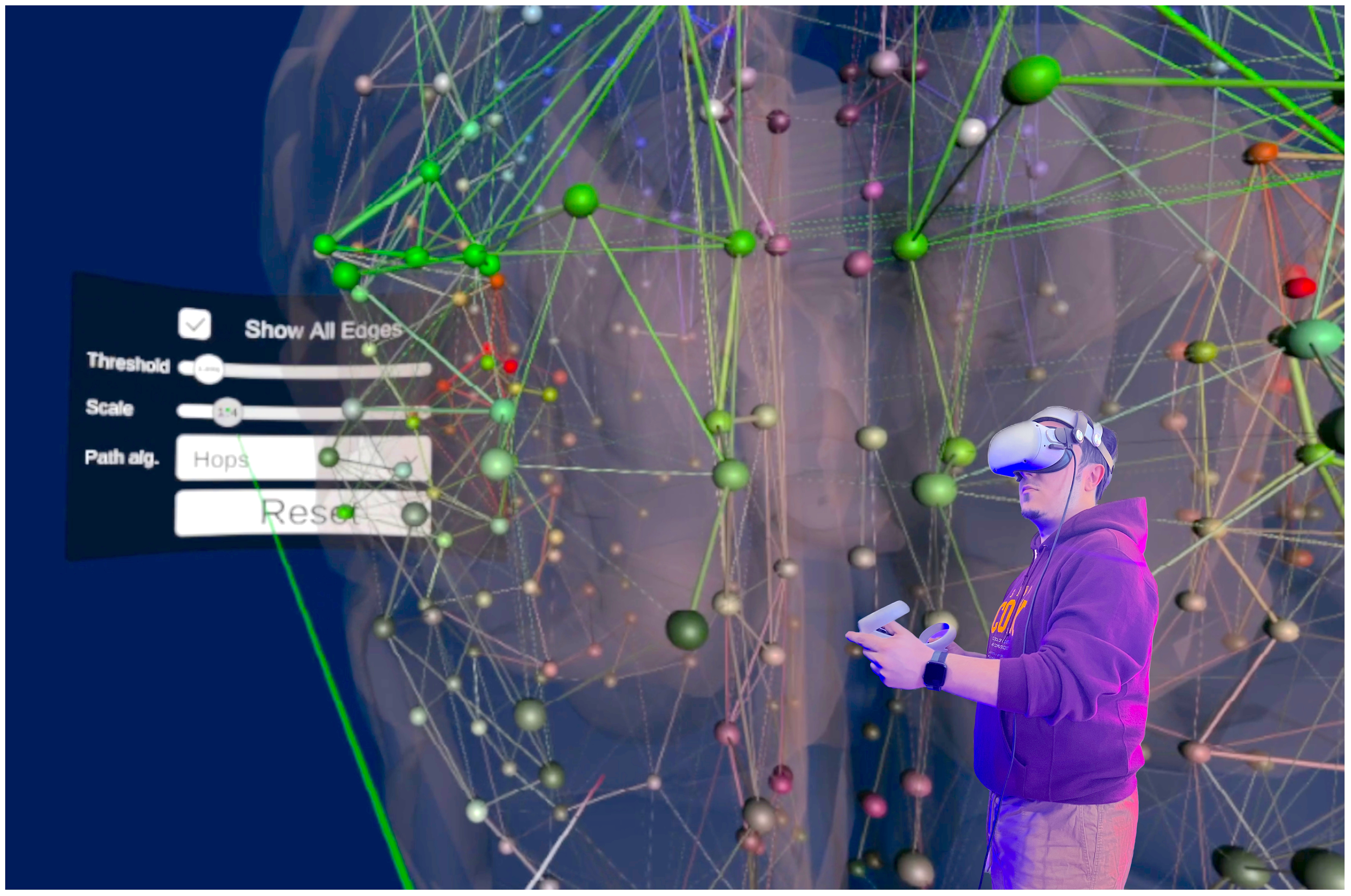 The application implements both controller-based and hand gesture-based interactions to enhance user convenience and versatility. These features were integrated using the Oculus integration SDK (v38). Although hand gesture detection is still in the early stages of development, the pinch gesture and controller trigger button were successfully implemented for node selection. The virtual visualization of the controller mesh object allows users to see the controls and buttons within the VR environment.