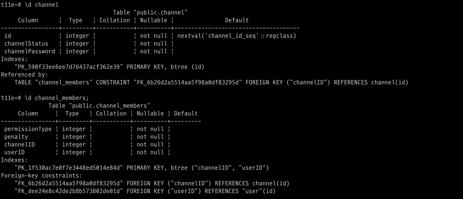 채팅방 생성을 위한 channel entity 를 만들고 relation을 설정하였습니다.