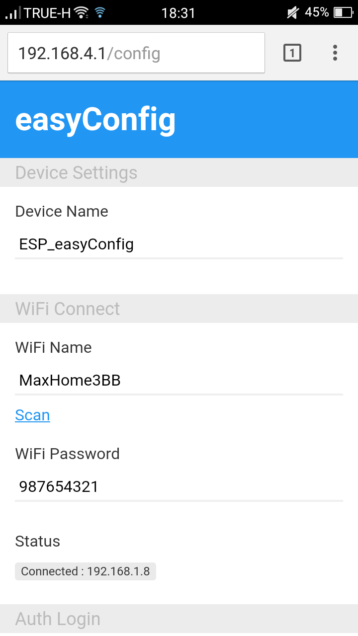 - ESP8266 จะจำค่าที่กรอกไว้ แล้วรีเซ็ตตัวเอง รอประมาณ 5 - 30 วินาที แล้วเชื่อมต่อ WiFi ไปที่ ESP8266 ใหม่อีกครั้ง ถึงจะกลับมาเข้าหน้าคอนฟิกได้
