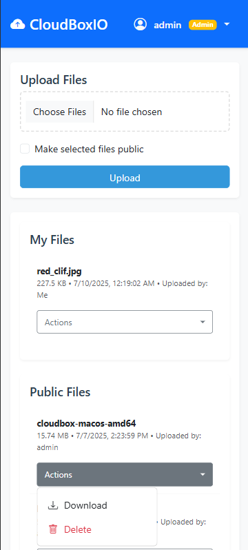 CloudBoxIO allows users to securely upload, share, and manage files with JWT-based authentication and an optional minimal UI. Built for simplicity and portability, it runs as a single binary and stores data using SQLite.