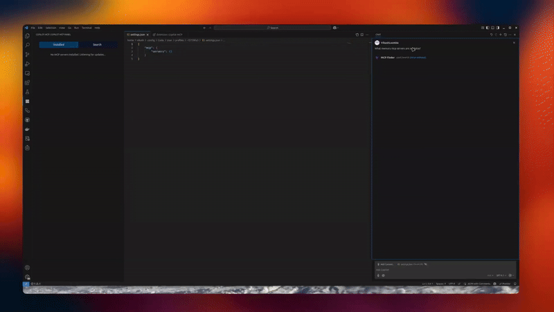 A powerful VSCode extension that allows you to discover and install open-source MCP servers, enabling seamless integration between MCP tool servers and GitHub Copilot Chat. Join the growing ecosystem of interoperable AI applications with flexible integration options.
