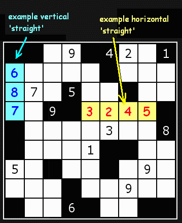 Rows and columns are divided into compartments of white squares. Look at the diagram on the right which has two 'straights' filled in and highlighted. The black cells separate the compartments. Compartments can be both vertical and horizontal.