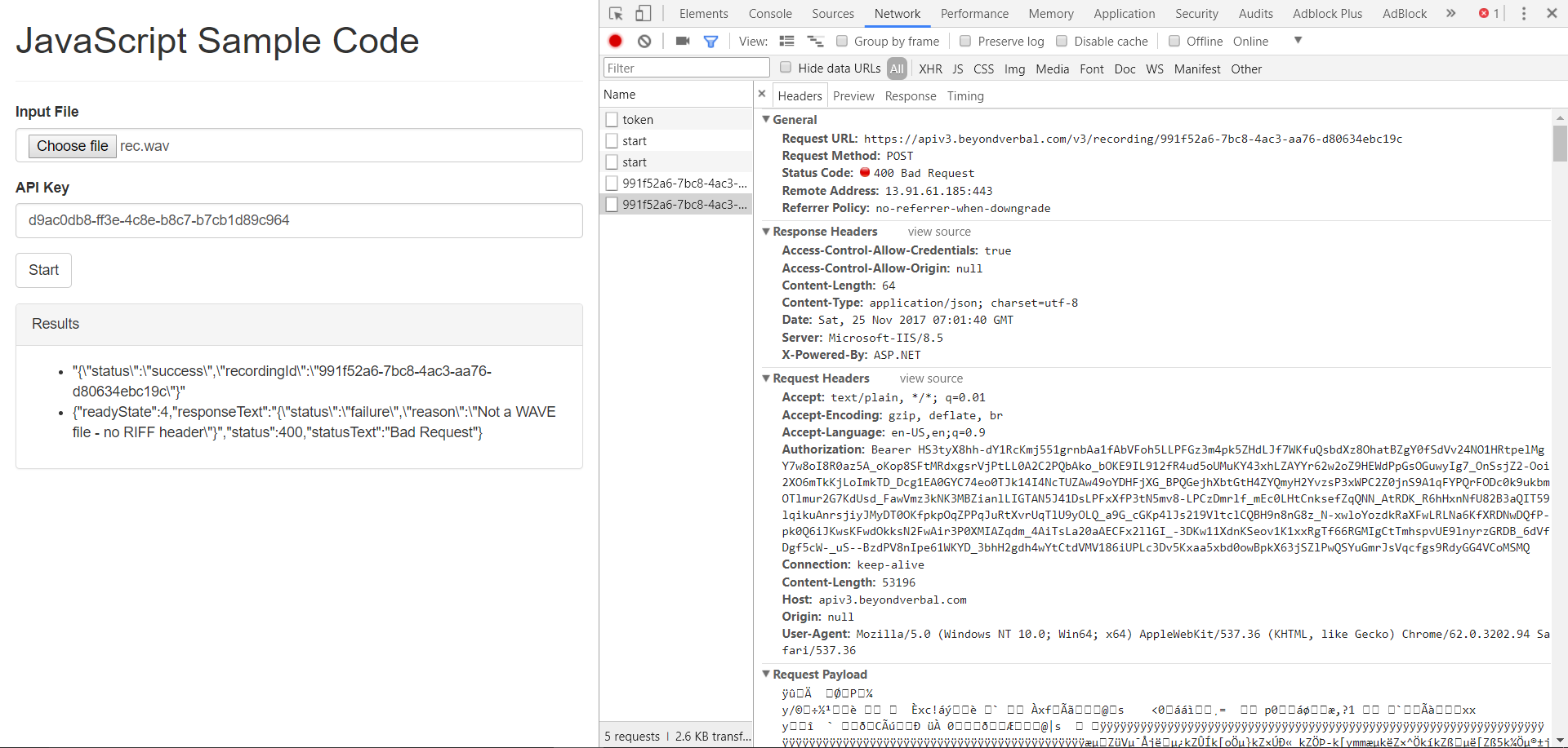 Hello there, This sample is not working. I'm getting the same error again and again, from the Sample, as well as from POSTMAN when I try to hit the API. Here's a Screenshot of the same:  Can you please help me out?