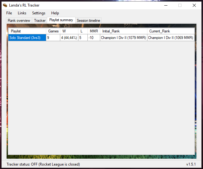 Landa's RL Tracker is a tool that allows tracking Rocket League gaming sessions. It gives live detailed information about matches being played for any playlist. Only Steam platform running in a Windows 7+ machine is supported.