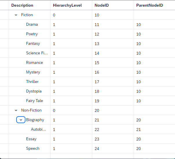 @sap.hierarchyannotations it is possible to inform UI5 of what kind of Tree information is inside the columnTreeTableto function and uses nativeCDLto achieve these results.levelinformation only is required for determining root entries. All children are fetching using the parent relation.