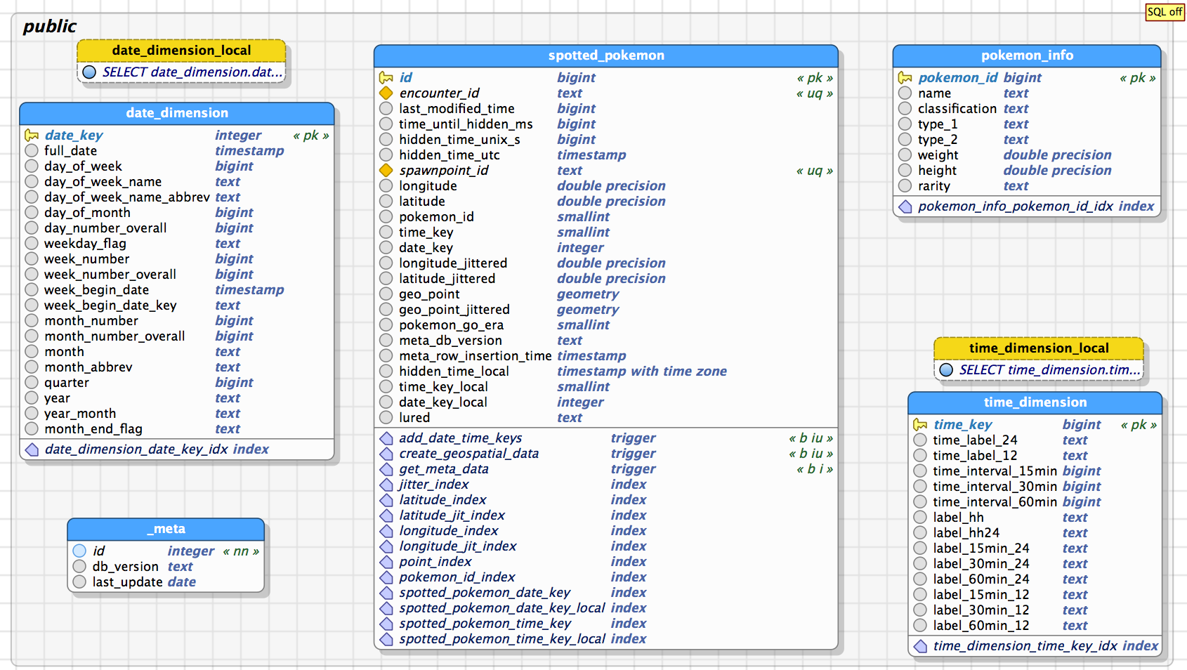 It looks like a lot, but it isn't. spotted_pokemon is where all your data goes. The date_dimension and time_dimension tables let you slice and filter by dates and times, and the pokemon_info table lets you do the same with Pokemon information. _meta keeps track of changes to the schema itself. date_dimension, time_dimension, pokemon_info and _meta all connect to the spotted_pokemon table.