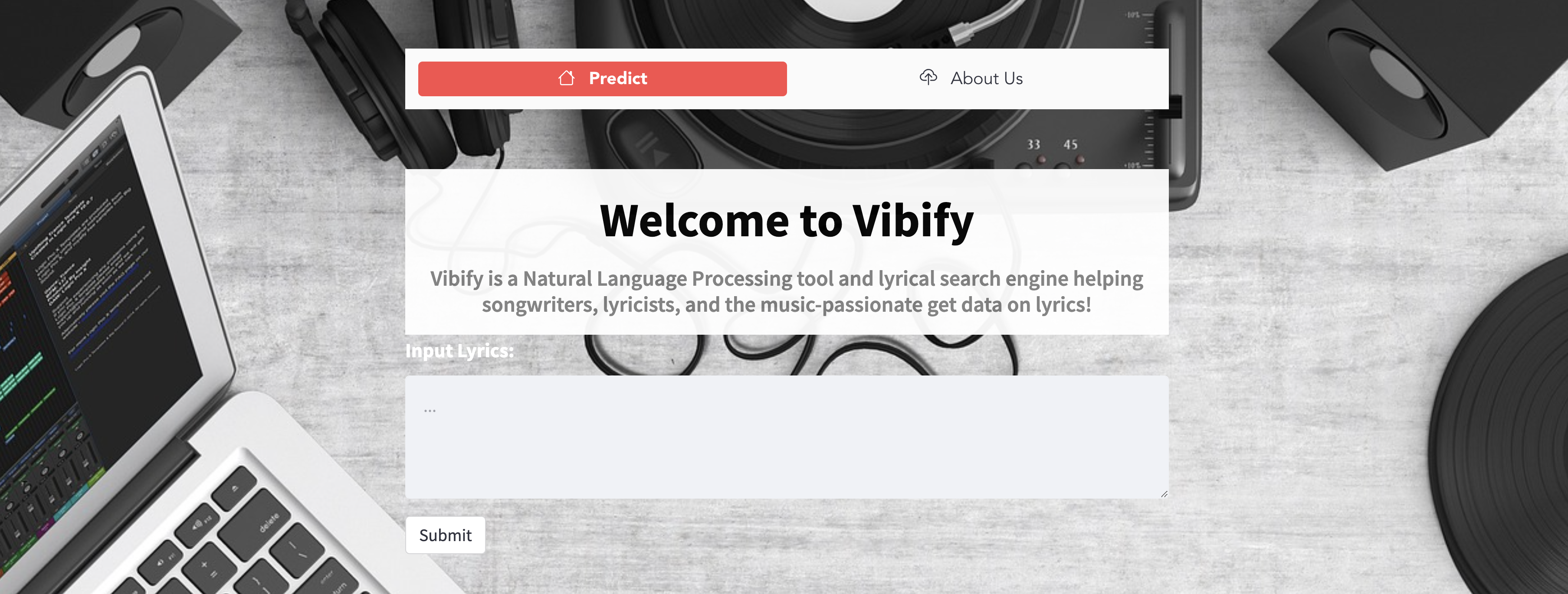 Vibify, short for "Vibe-Identify," is a web application designed to support the songwriting process. Leveraging NLP (Natural Language Processing) and deep learning, this tool analyzes lyrical data, identifies its sentiment, and offers inspiration through lyrically similar songs.