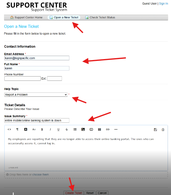 - Details: Describe the issue briefly (e.g., "The entire online banking system is down, preventing users from accessing their accounts.")