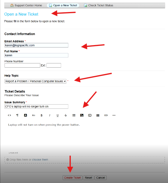 - Details: Describe the issue briefly (e.g., "The CFO's laptop is not powering on, and it needs urgent attention.")
