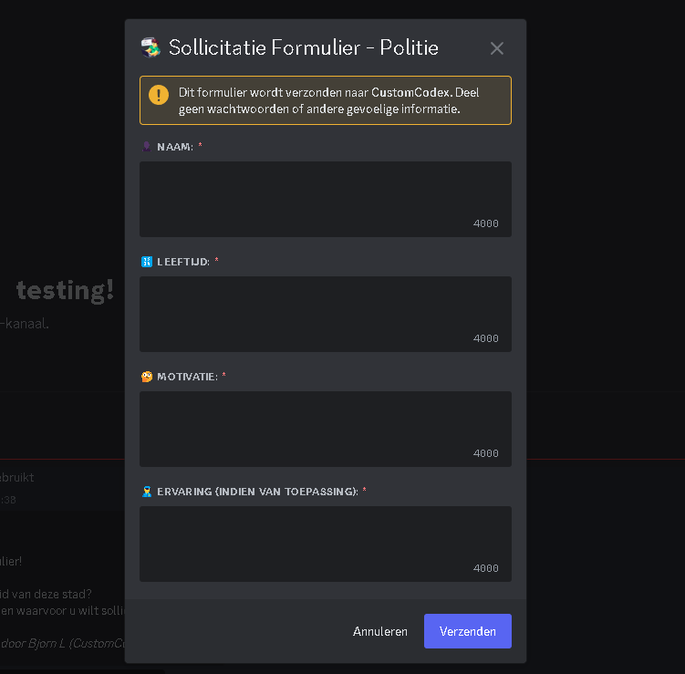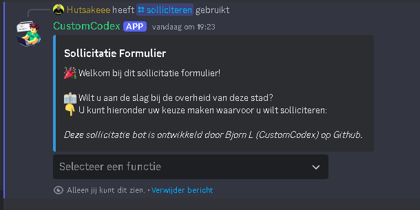 /solliciterenin a channel and press Enter. The bot will display a menu where you can select a position you want to apply for. After selecting a position, a pop-up form will open where you can answer the application questions.