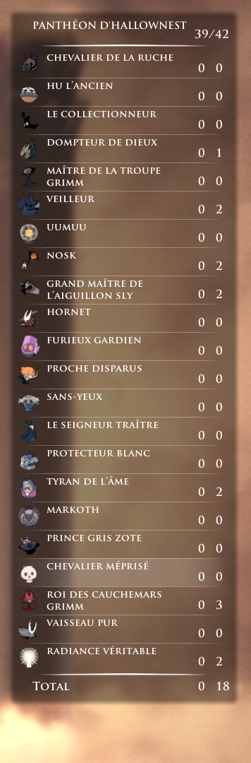 PantheonsHitCounter is a Hollow Knight mod which adds an in-game interface to count hits in the pantheons of Godhome.