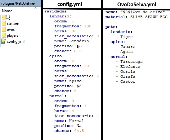 Ovos podem ser comprados com dinheiro virtual (cash) ou obtidos através de mascotes repetidos. A configuração de o que cada ovo tem e suas chances podem ser configuradas pelo administrador do servidor através de 2 arquivos yml, um deles da configuração em geral de cada raridade dos ovos e o outro o arquivo do proprio ovo. Os ovos podem ser visualizados pelos jogadores por um menu virtual utilizando o comando /pets.