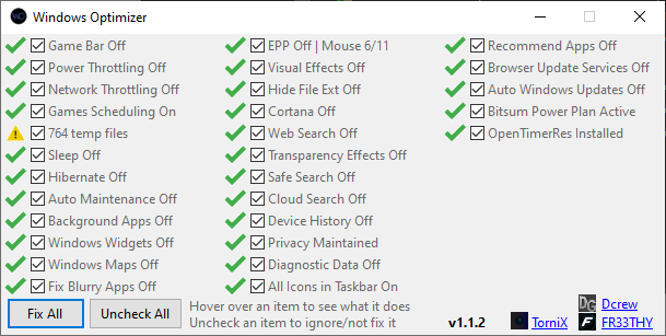 Windows Optimizer is an app for Windows 10 & 11 that applies many "fixes" (changes system settings) in order to maximize performance both for work and gaming especially.