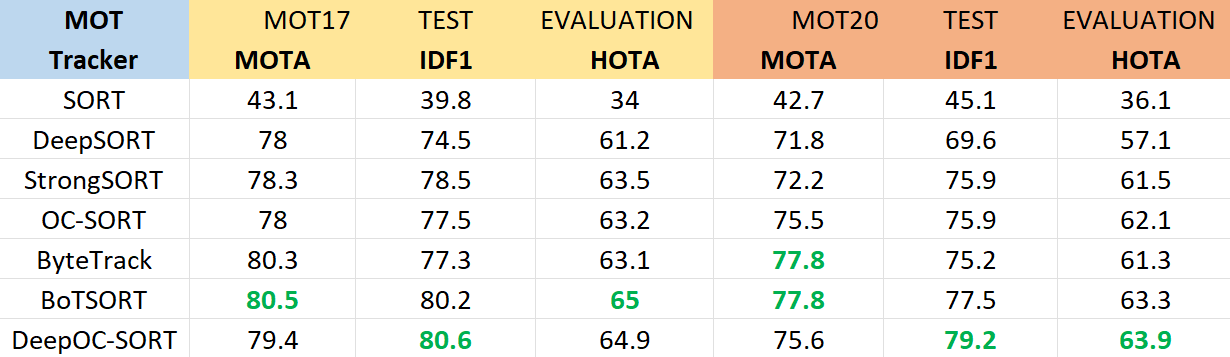 Below table shows the standard MOT17 and MOT20 Test Evaluation results of these trackers using evaluation metrics - Multi-Object Tracking Accuracy(MOTA), Identification-F1(IDF1), Higher-Order Tracking Acuracy(HOTA)