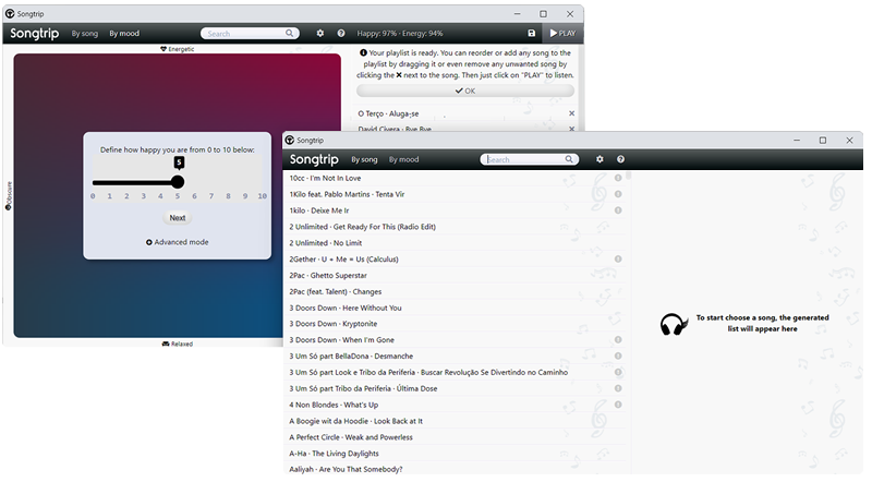 Even if you don’t have a specific song in mind, you can tell Songtrip how you’re feeling with very few clicks and generate a playlist easily that is in tune with your current mood.