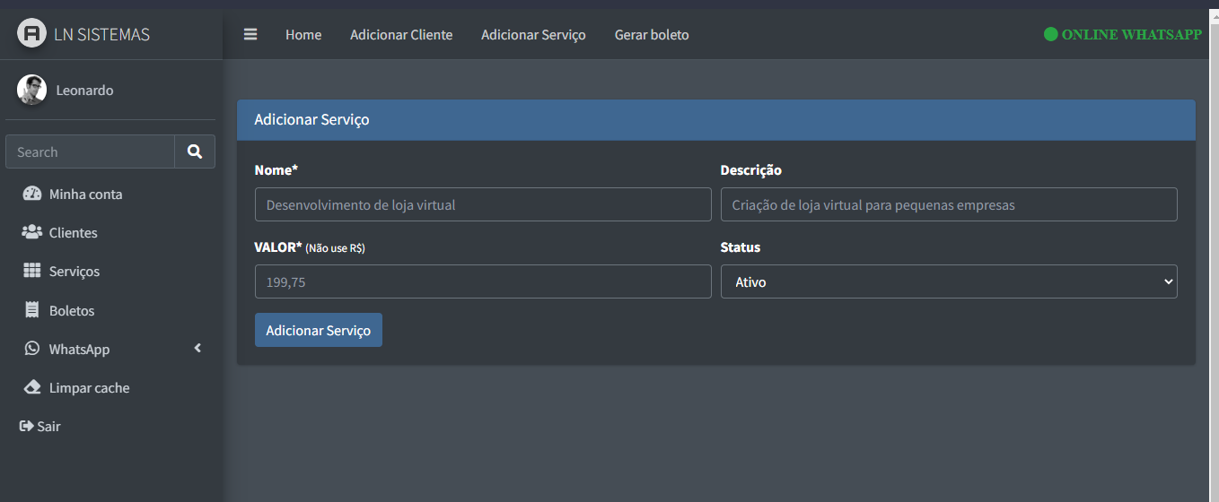 O sistema irá procurar clientes com o status "ativo" e com serviços atrelados, irá gerar o boleto, enviar por e-mail e se o WhatsApp estiver configurado, também será enviado pelo WhatsApp.