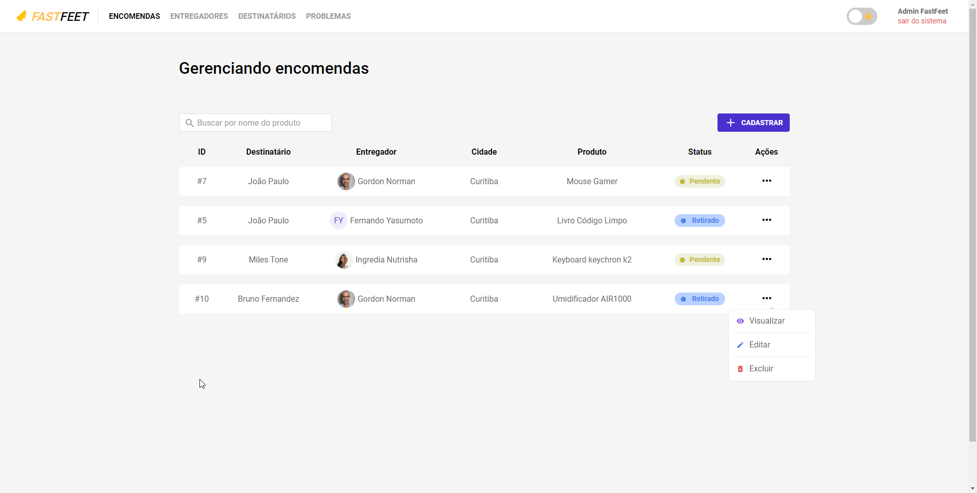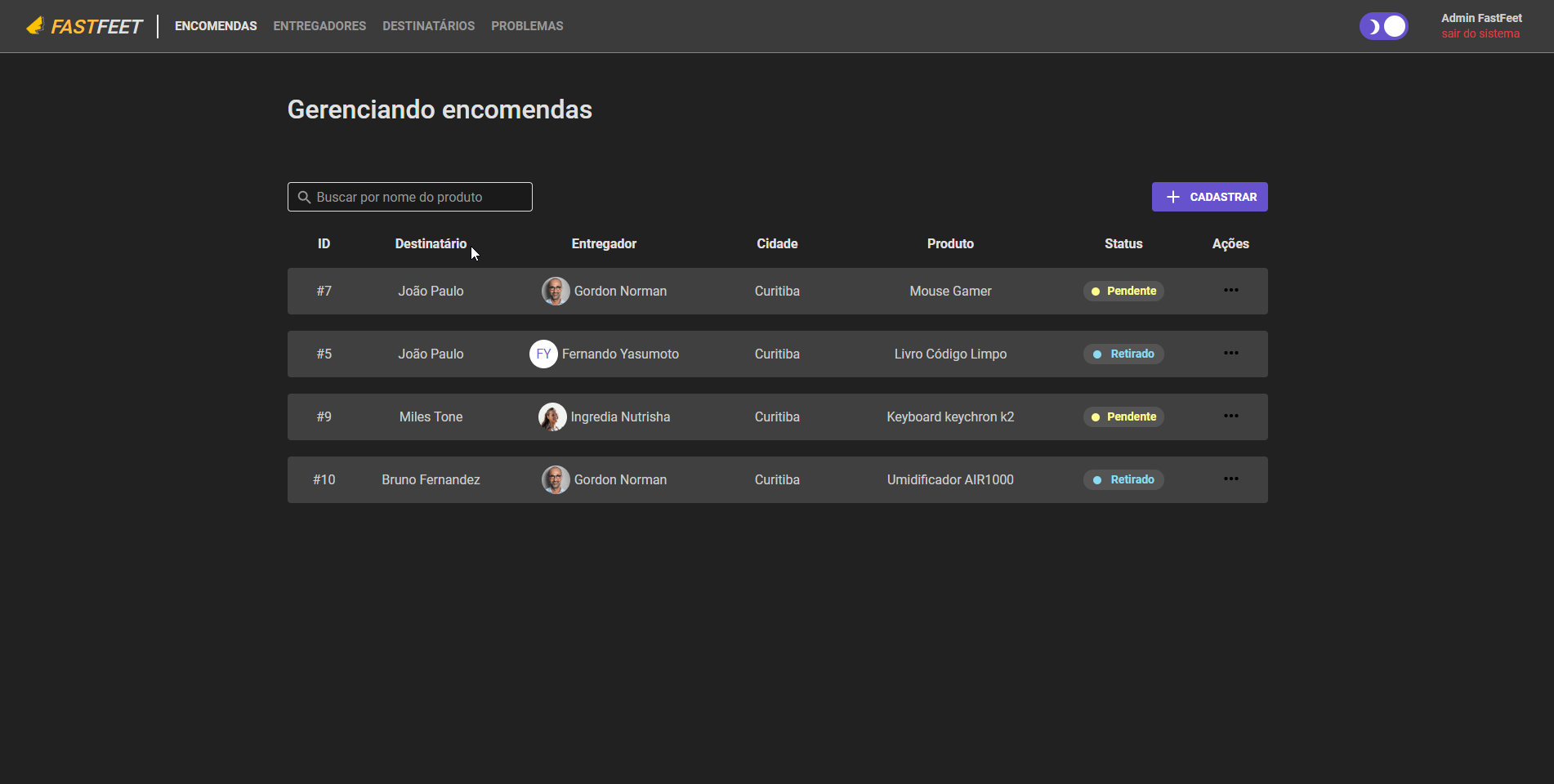 Fastfeet is a delivery application where the deliveryman can handle his deliveries easily using the app on Android or IOS, while the admin can have control over all the deliveries in real time. This project was built in Typescript with Node.js, ReactJS and React Native .