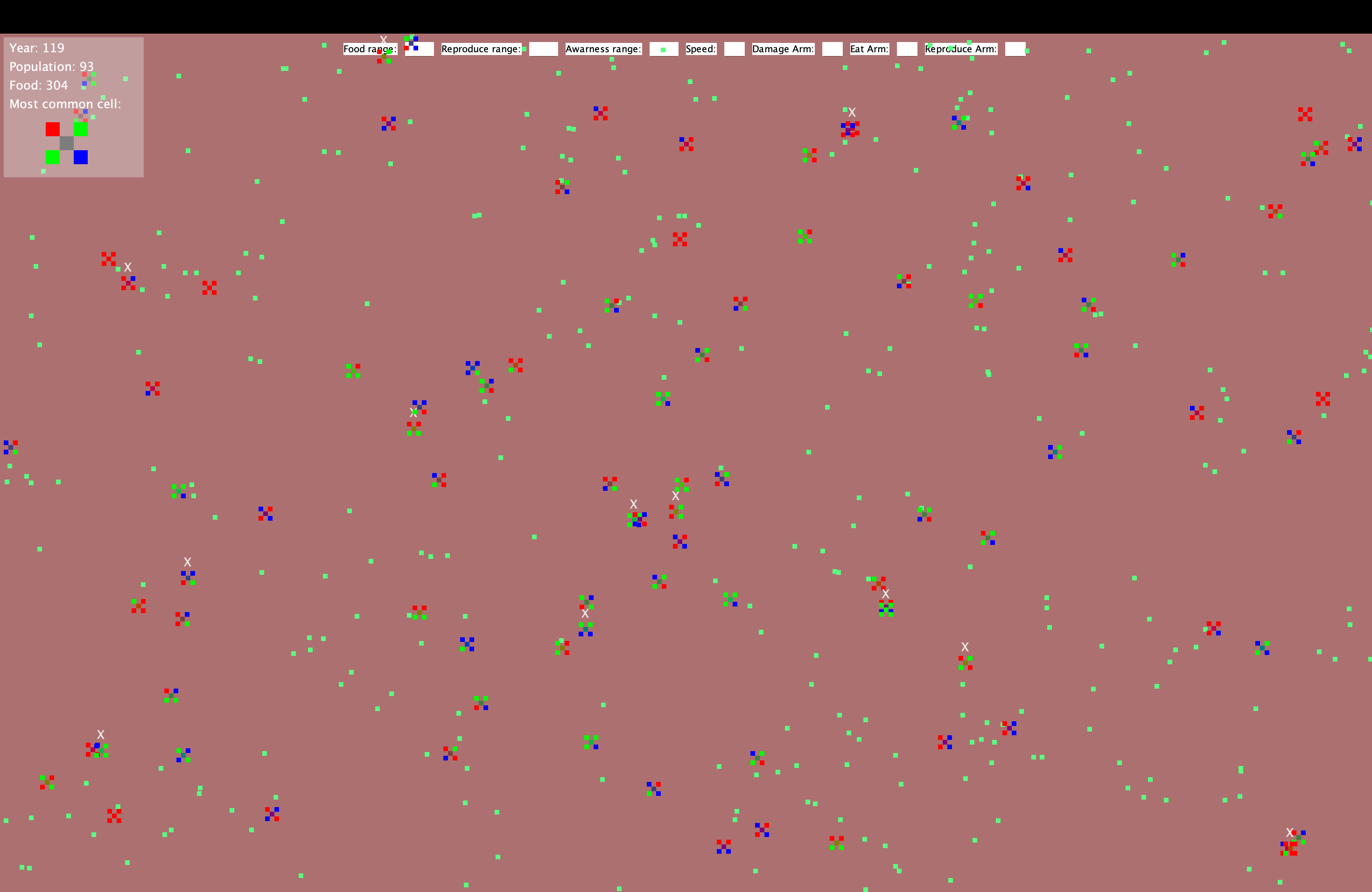 The program contains a simple rough GUI. It's possible to see the most common cell, the current year of the world, the current population, and the total amount of food in the world. On the top of the screen it is possible to set specific values for the generation of a new cell. In order to generate a cell it is possible by clicking on any point of the screen.