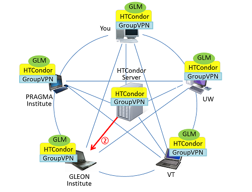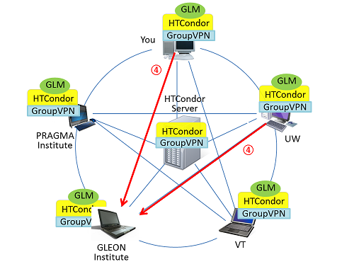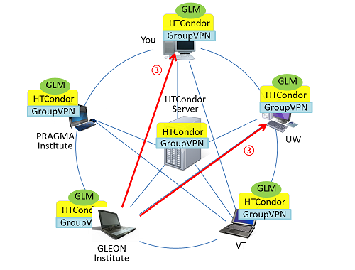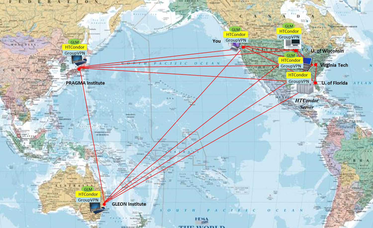 The GRAPLE HTCondor pool consists of a central server (the "master" job scheduler) and distributed nodes (the job "workers" and job "submitters"), all connected securely by the IP-over-P2P (IPOP) GroupVPN overlay virtual network. An example of an HTCondor pool is shown in Figure 1. The server is located in the University of Florida, and job submitter/worker nodes are distributed all around the world: for example, at Virginia Tech, University of Wisconsin, a PRAGMA institute in Japan, and a GLEON institute in Australia.