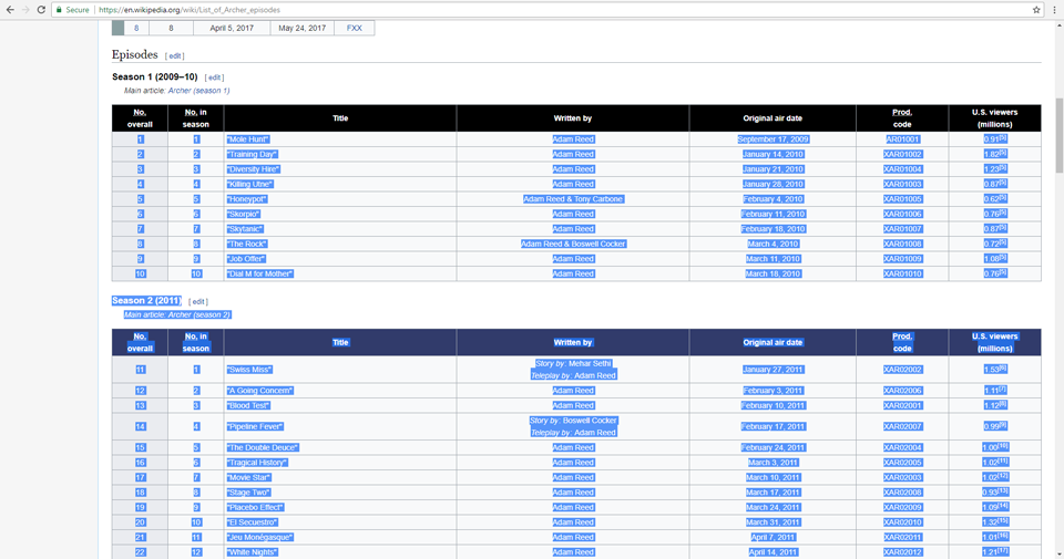 Step 1: Go to the show's "List of Episodes" entry on wikipedia. For example, here is the list of Archer episodes.