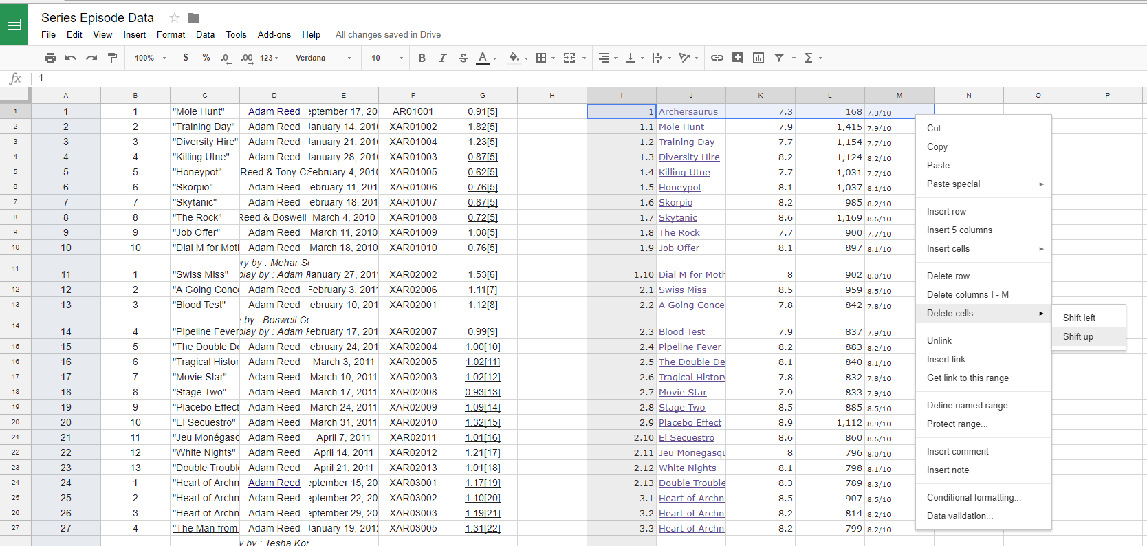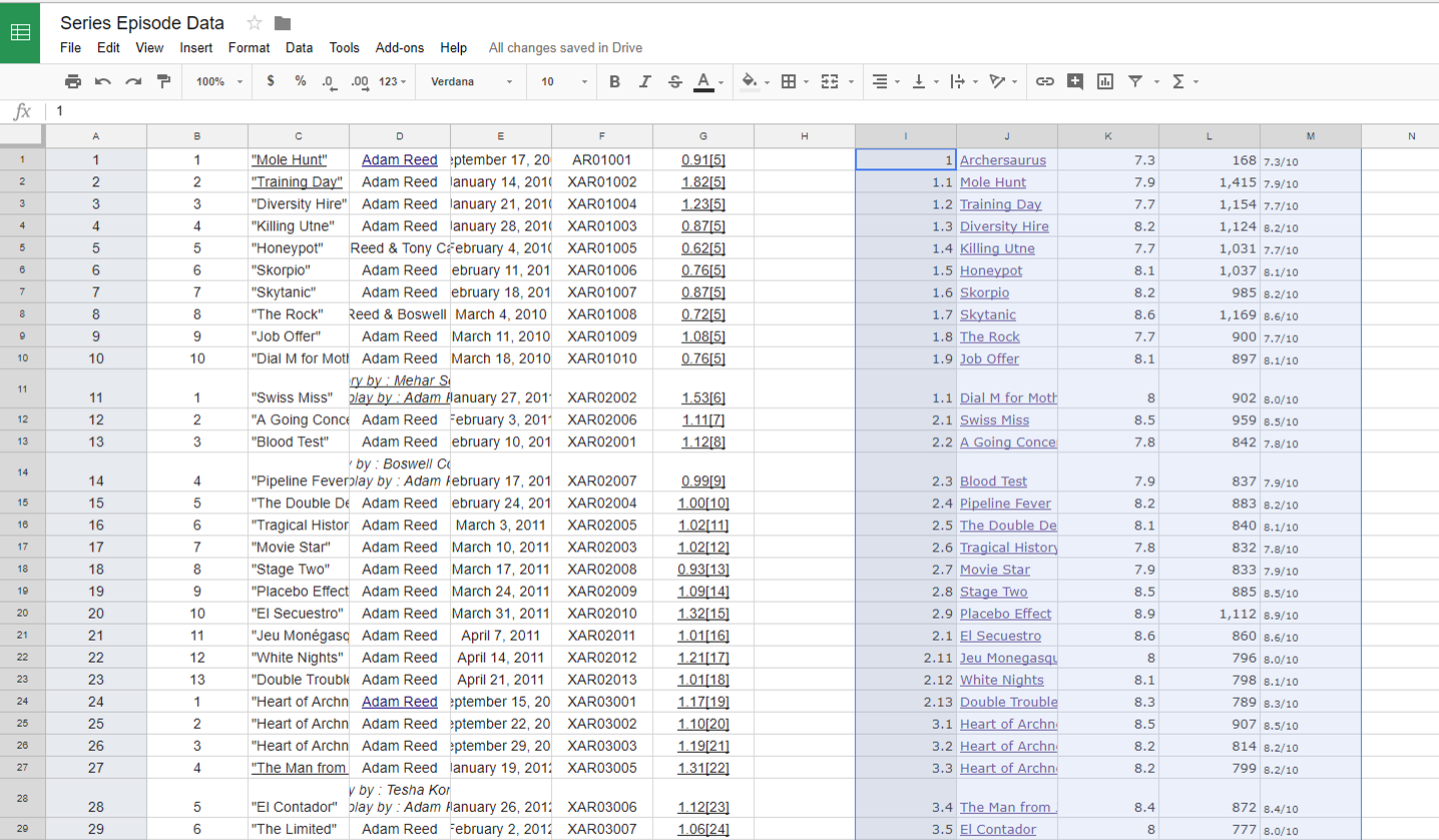 Step 9: Now make sure the wikipedia data and the IMDB data line up. Sometimes IMDB will do things like count bonus episodes (as in the case here with "Archersaurus") or split up 2-part episodes. Add and delete cells until the title names for the wikipedia episodes and the title names for the IMDB episodes match.