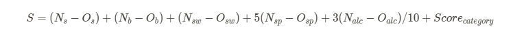 궁합도는 일반적으로 같은 주종끼리는 같은 음식이 잘 어울리는 것과, 탄산감이 있을 시 같은 탄산감이 있는 제품들과 어울리는 안주와 어울리는 것과 뿐더러 알코올의 경우 같은 당도 탄산이라 할 지라도 다르게 느껴지게 할 수 있기 때문에 다음과 같은 통념을 기반으로 하여 목적 함수를 구현하였다. s = sour / b = bitter / sw = sweet / sp = sparkle / alc = alcohol