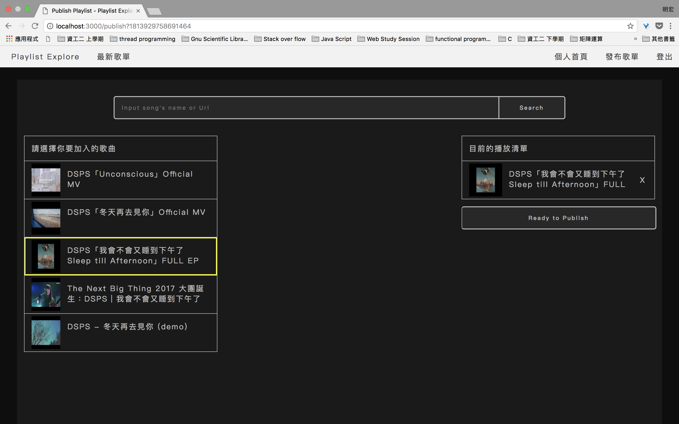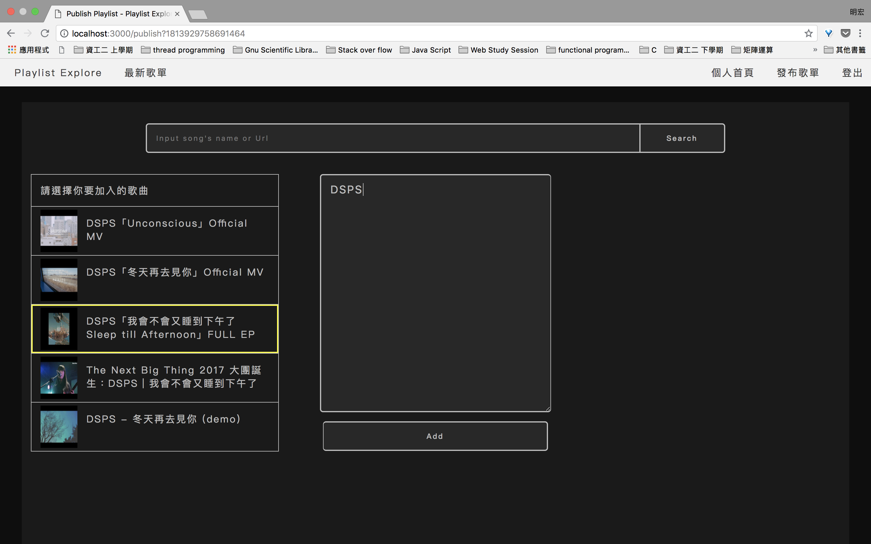 URL: 直接傳入歌曲Youtube URL加入歌單關鍵字: 支援youtube關鍵字Auto Complete,送出搜尋後列出與關鍵字最相關5筆