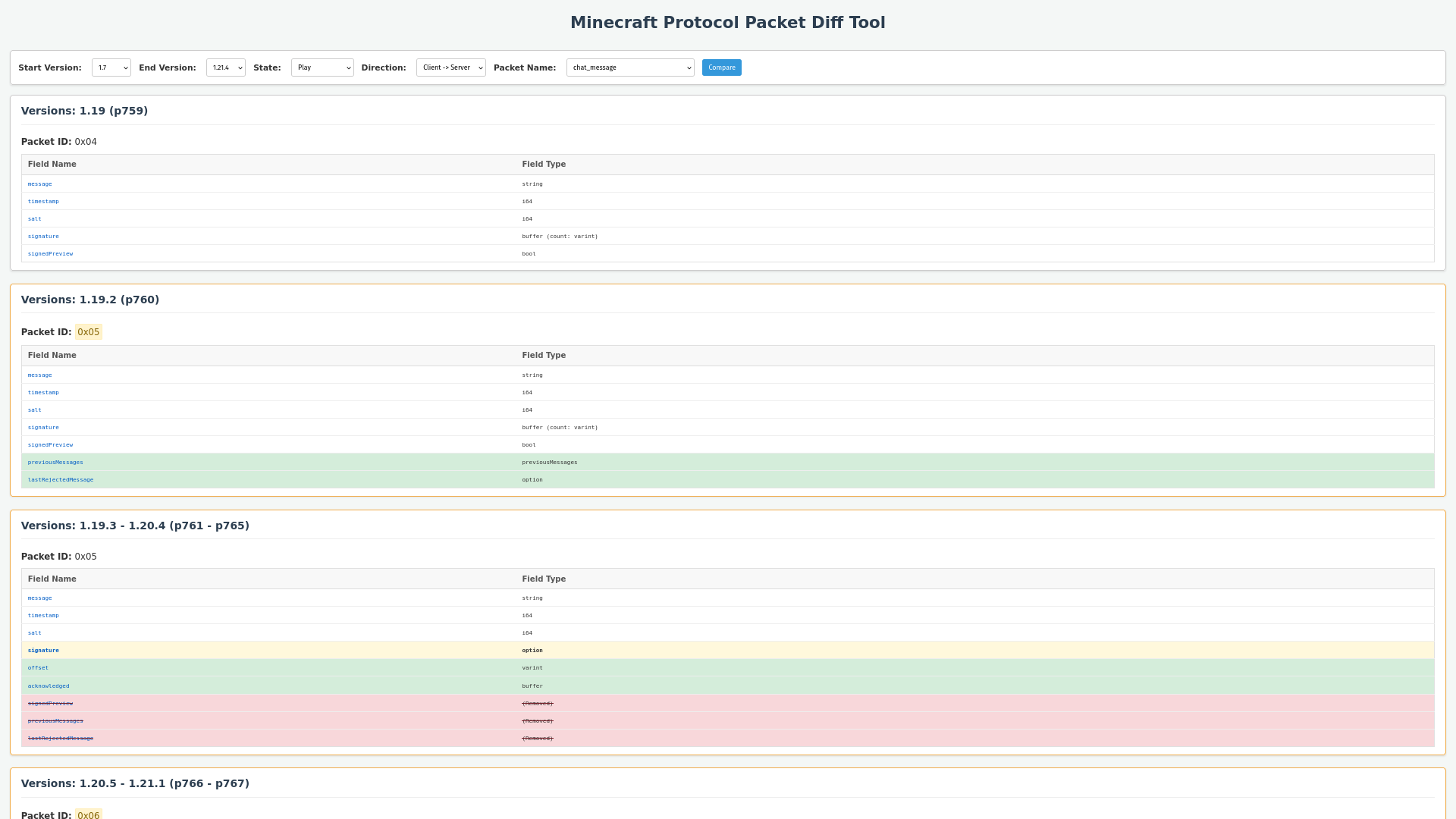 - The results area will display the comparison, showing groups of versions where the packet ID and structure remained the same. Changes between these groups will be highlighted. Protocol version numbers (e.g.,