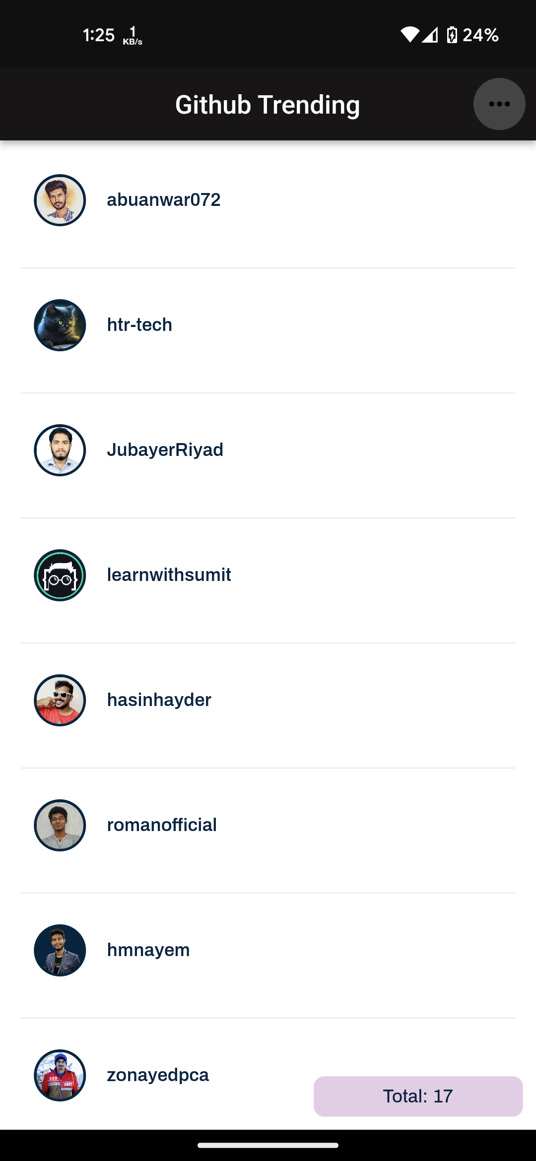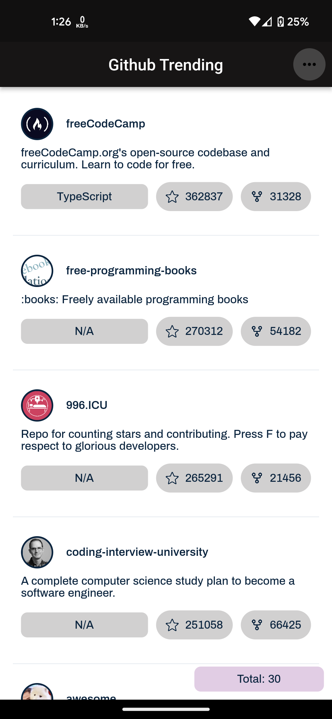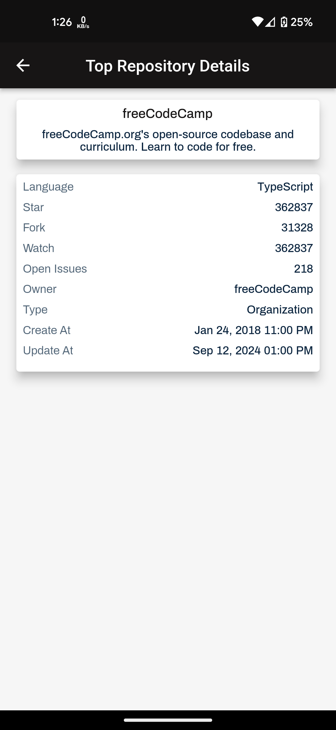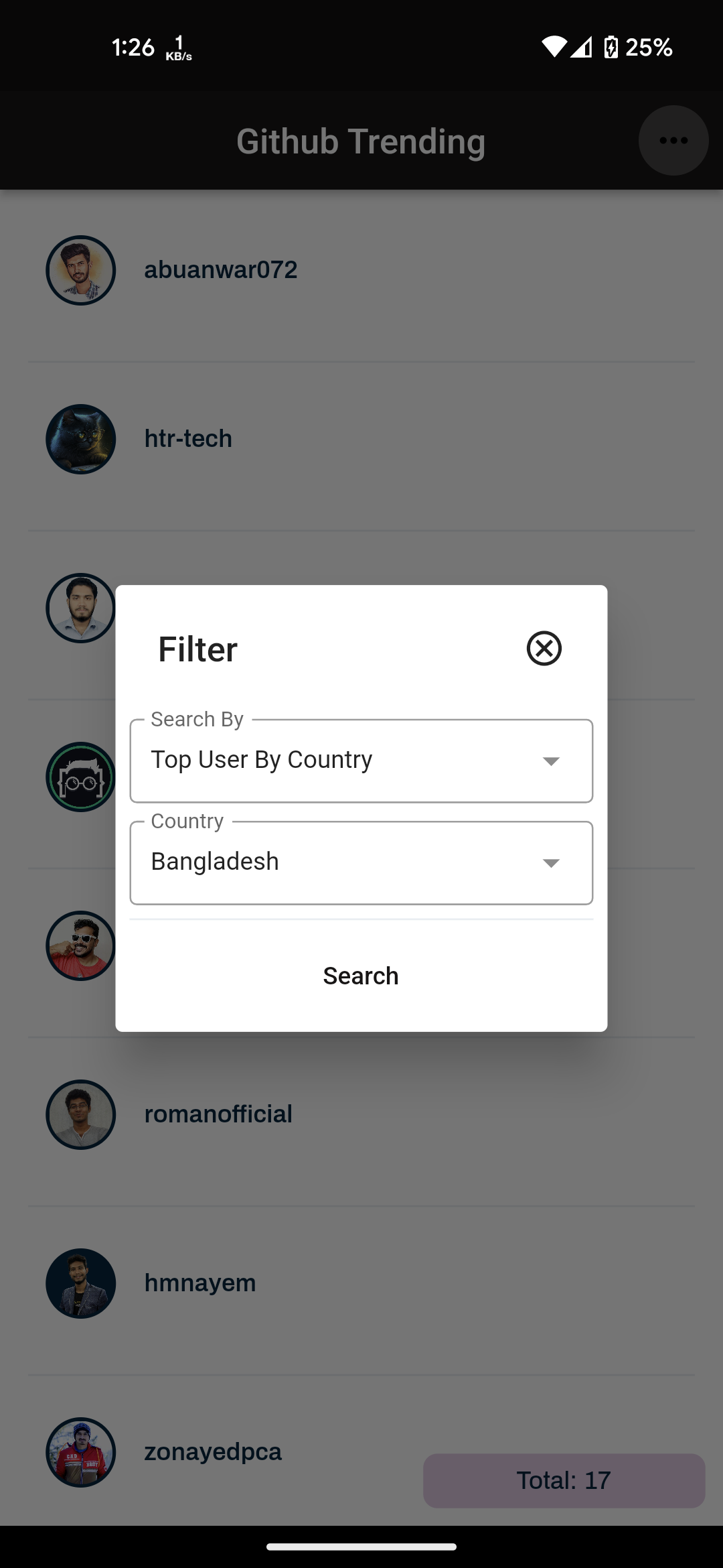github_trending How to run Prerequisite Flutter 3.7.3 (Stable) Dart 2.19.2 Build $ flutter build apk --release Run $ flutter run Github api documentations https://docs.github.com/en/rest Heres is some screenshot Splash Screen Filter Top User by Country Top User Details Top Repository Top Repository Details
