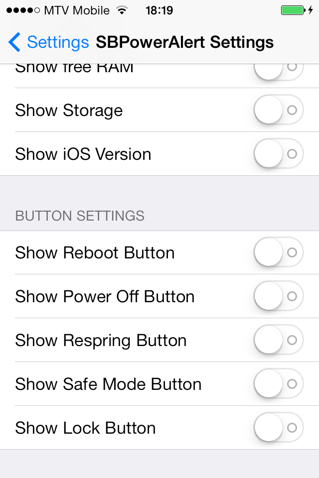 Displays a Popup with different Options and displays the available Memory, Data IP Address, Wifi IP Address, Wifi Network Name, iOS Version and more..