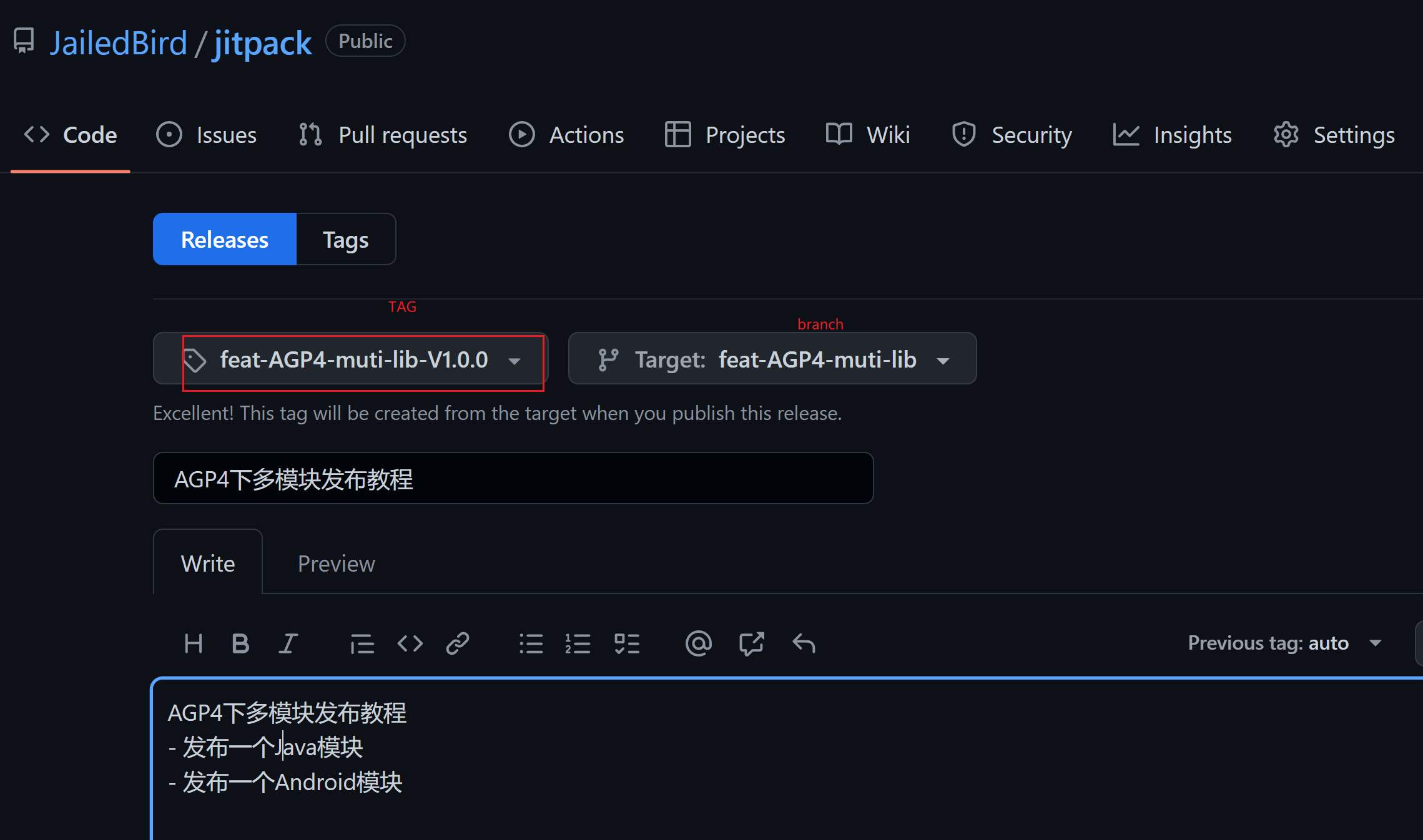 无法本地发布, 因此无法本地验证是否可以正确生成aar文件; 对此可以在不发布github release的情况下使用SNAPSHOT验证你的分支是否可以正常打包; 操作方法为在jitpack的Branches这里选择你要打包的分支,默认的TAG名称: 分支名+SNAPSHOT, 通过可以快速发布SNAPSHOT library, 也可在不占用版本号的情况下验证是否可以正常打包;