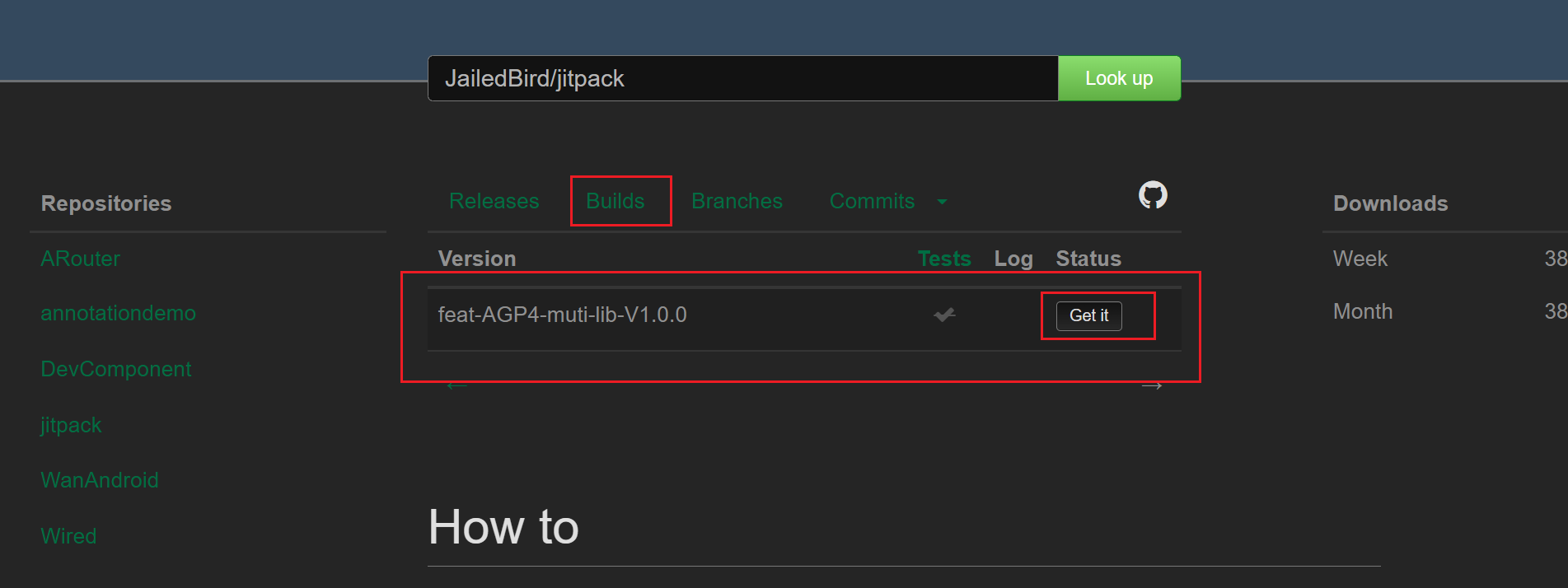 使用当前github账号登录 jitpack.io, 找到之前发布的release, 点击get it, 等待构建成功;