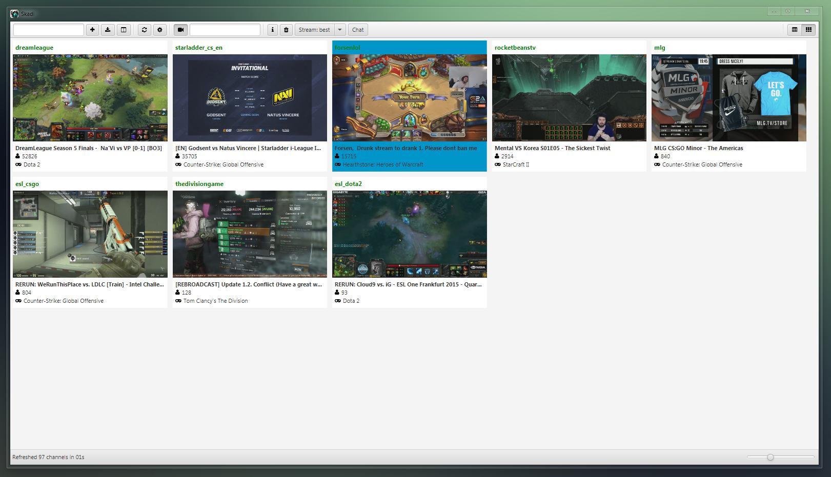 Skadi allows you to comfortably watch Twitch channels via streamlink / VLC (or any videoplayer compatible with streamlink) and to enjoy open the Twitch chat of the channels you are watching. Skadi can import the channels you follow from Twitch so you don't have to add them all manually and will display a notification if a channel goes live.