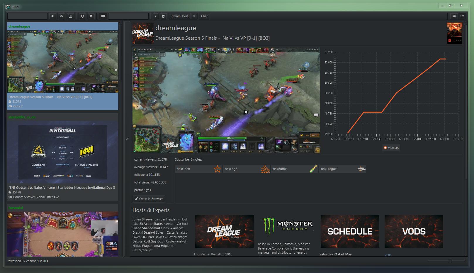 - channel detail pane (double click on a channel or click the 'i' button) showing the channel panels, preview, stats, sub-emotes and a viewer graph