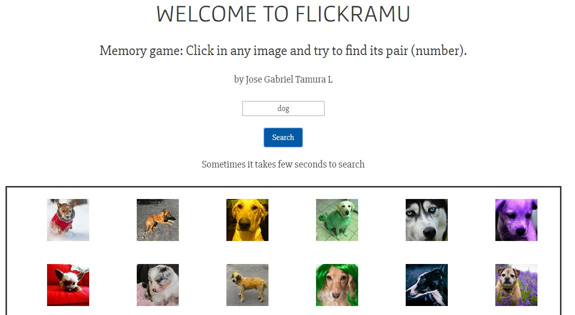 En el front end se desarrollan varias funcionalidades y esta escrito en javascript- react. La pagina principal es /src/components/app.js. Cuando el usuario a ingresado en el input el termino deseado y presiona el boton de SEARCH, app.js crea en render la matriz que tiene una lista de columnas, que tiene una lista de fotos a desplegar. Adicionalmente, cada foto es un boton, y tiene un numero del 1 al 15 asociado a ella. Esto para propositos del juego descrito anteriormente. Para realizar otra busqueda se borra el campo input y se da SEARCH de nuevo.