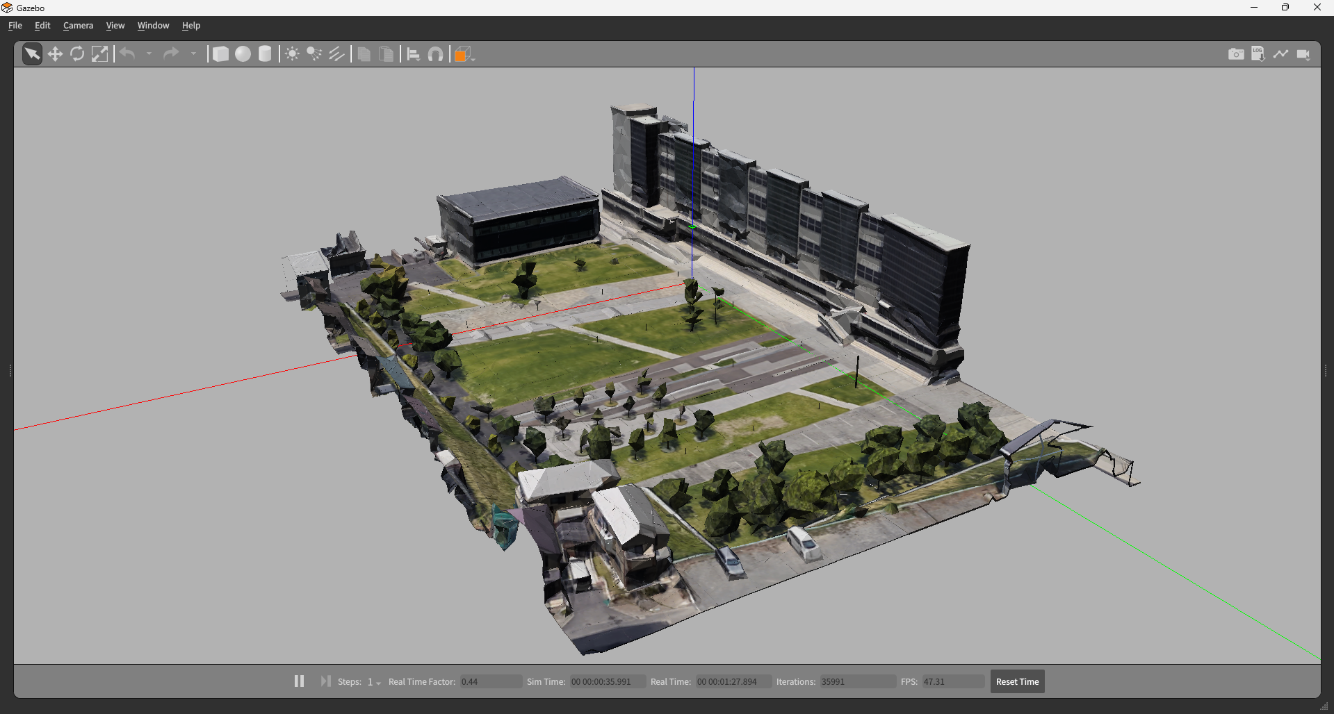 private_gazebo_modelsに法政大学中庭のgazebo worldを置いておきます。google mapから作っているのでサイズは完璧にできていると思います。ナビゲーションなどのパラメータ調節にご活用ください。