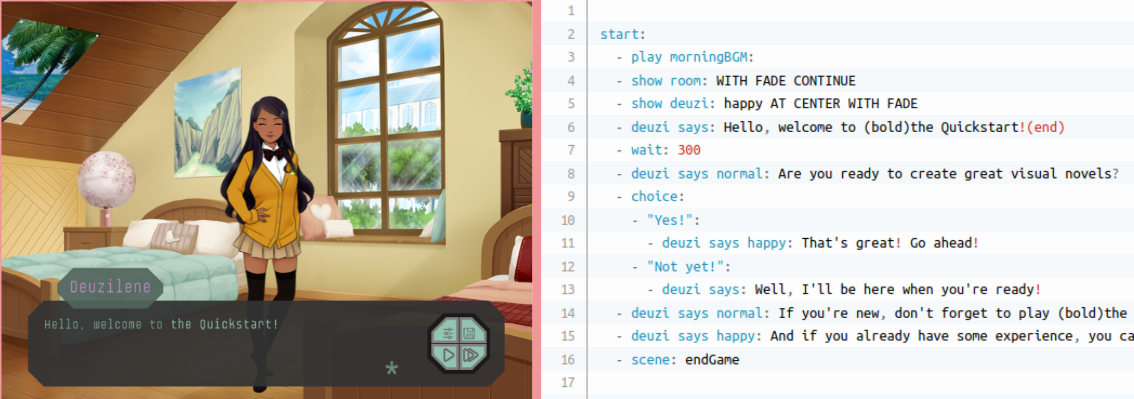 RenJS is a HTML5 Visual Novel creator made for writers. The stories are written in a script akin to a screenplay, without the need to do any programming. This script contains the scenes of the story, and each scene contains actions. These actions include everything you might want to do in a classical Visual Novel game, such as: