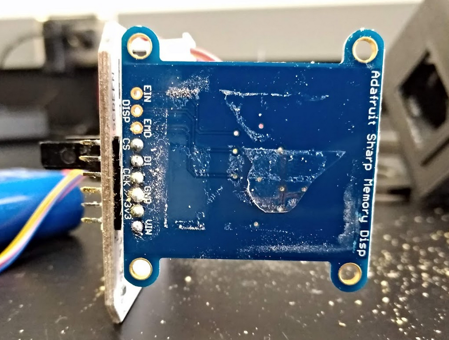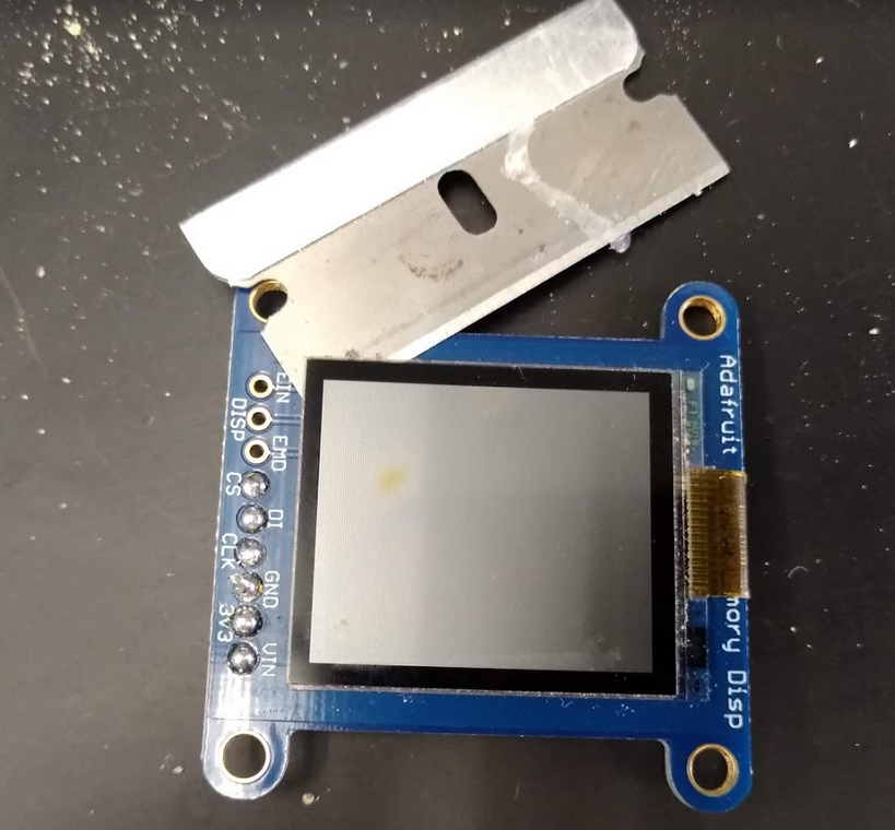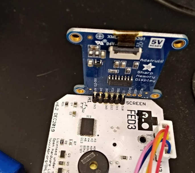 The Adafruit Sharp Memory Display module contains two parts: 1) the display itself, made by Sharp and connected by a thin ribbon cable to 2) the Breakout PCB made by Adafruit. It is easiest to leave the break-out board on the FED3 PCB in place and just replace the display. This is much easier than de-soldering the breakout board to remove it from the PCB. Unfortunately you cannot purchase the display from Sharp in quantities <1000 so you will likely need to purchase a whole new screen assembly from Adafruit to do this repair.