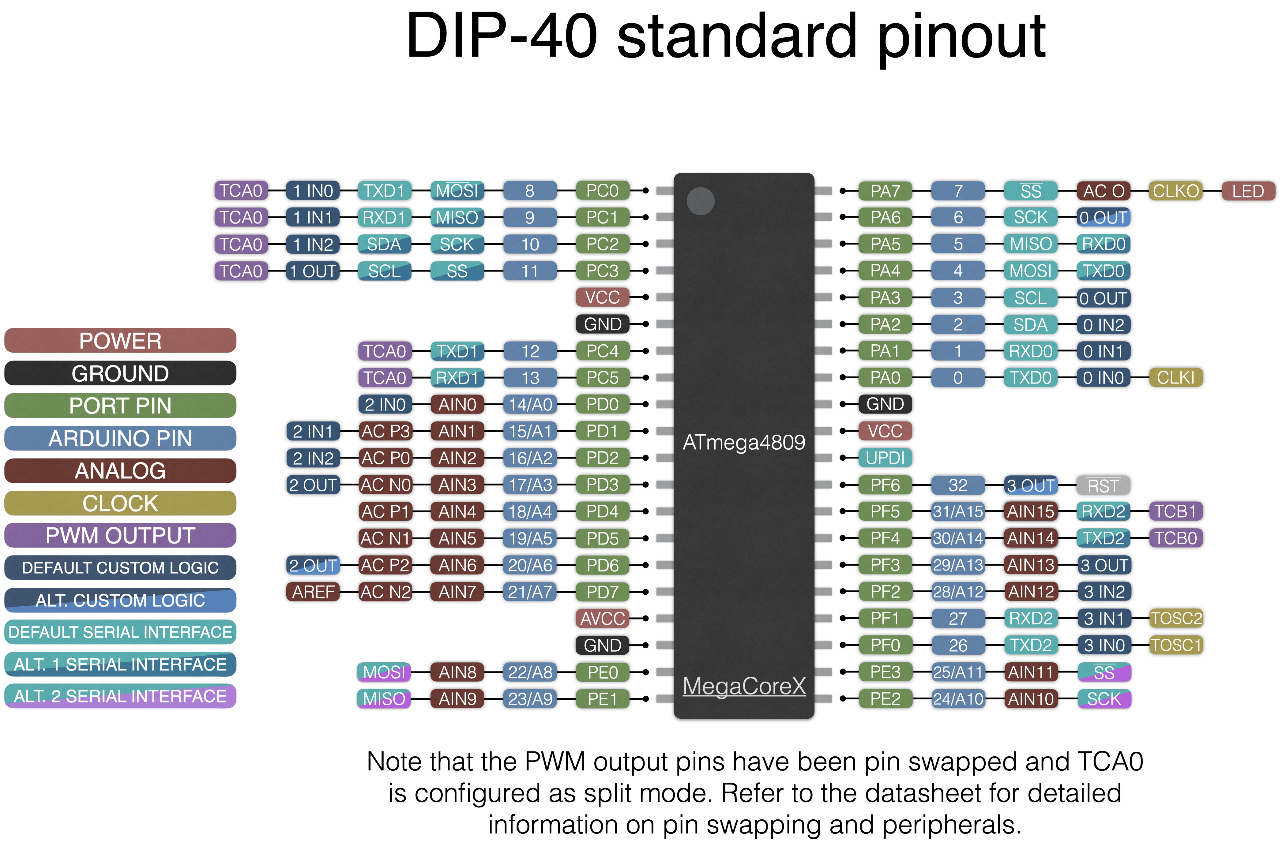 - 40 pin standard: This pinout is more or less identical to the 48 pin variant, but with a reduced pin number. Note that this pinout is only available on ATmega4809.