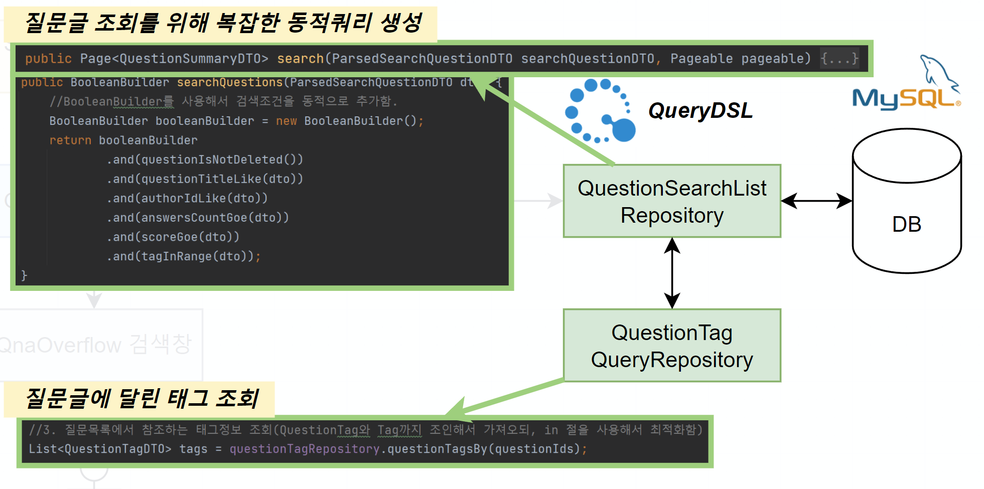 //1. 질문목록 조회( 추가로 질문의 답글개수와 유저 이름을 같이 가져옴 ) /*...질문목록 조회하는 코드는 생략...*/ //2. 연관된 태그정보 조회쿼리의 In절에서 사용할 ID 컬렉션을 스트림으로 생성한다 List<Long> questionIds = questions.stream() .map(QuestionSummaryDTO::getQuestionId) .collect(Collectors.toList()); //3. 질문목록에서 참조하는 태그정보 조회(QuestionTag와 Tag까지 조인해서 가져오되, in 절을 사용해서 최적화함) List<QuestionTagDTO> tags = questionTagRepository.questionTagsBy(questionIds); //4. 태그의 Question ID값을 가지고 Map으로 그룹화 함 Map<Long, List<QuestionTagDTO>> tagMap = tags.stream() .collect(Collectors.groupingBy(QuestionTagDTO::getQuestionId)); //5. 태그정보 입력 questions.forEach(question -> question.update(tagMap));