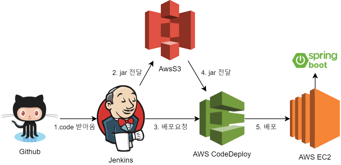 - 업로드가 끝나면 CodeDeploy에 요청을 해서 배포했습니다. CodeDeploy는 미리 작성한 배포스크립트를 실행해서 기존에 동작중인 스프링 애플리케이션을 중지시키고 새로운 jar을 실행합니다.