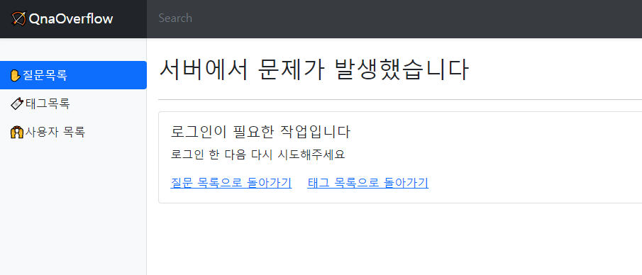 - 예외가 왜 발생했는지를 사용자에게 알려주기 위해서, 예외가 발생한 상황에 대한 설명을 메세지에 적어두었습니다. 그리고 ExceptionHandler 메서드에서 발생한 예외에 해당하는 메세지를 메세지 소스에서 꺼내와서 모델에 담았습니다. 에러페이지는 모델에서 ErrorDTO를 꺼내서 랜더링하여 사용자에게 현재 상황에 대한 설명을 할 수 있도록 구현했습니다. 아래의 이미지는 로그인 하지 않은 상태로 질문글 생성요청을 했을 때 볼 수 있는 에러페이지입니다.